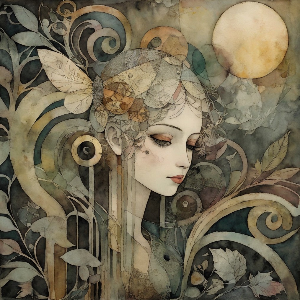 The artwork features a serene woman with intricate geometric patterns in her hair, adorned with leaves and floral motifs. Soft earthy tones complement the elegant composition, creating a dreamlike atmosphere.