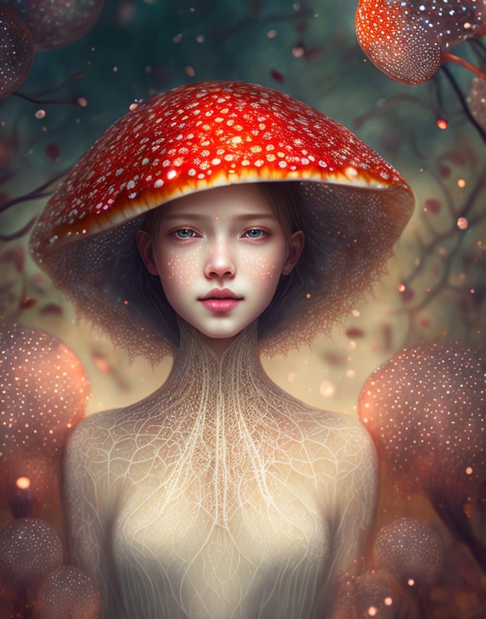 Prompt: "AI-Generated Art of full body of impossible female anthropomorphic amanita dressed in sparse honeycomb scattered cobwebs, very finely drawn face, shy smile, swarms of fireflies, red mushroom hat sits on her head, illuminated from below, flawless, hyperrealistic digital illustration by Elena Kraft, Mary Blair, H. R. Giger, Beksinski, Dariusz Zawadzki, Alejandro Burdisio, James Jean, vivid colours, fantastical surrealist otherwordly, photorealism highly detailed, intricate and fluid swirling, subsurface scattering, elegant, artstation, 16K octane render, volumetric light, colorful ambient occlusion, colorful ray tracing, textless!!!"
