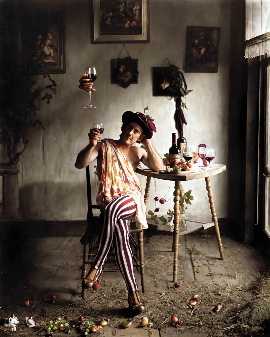 A man in historical clothing enjoys wine amidst an abundance of fruits in a rustic room.