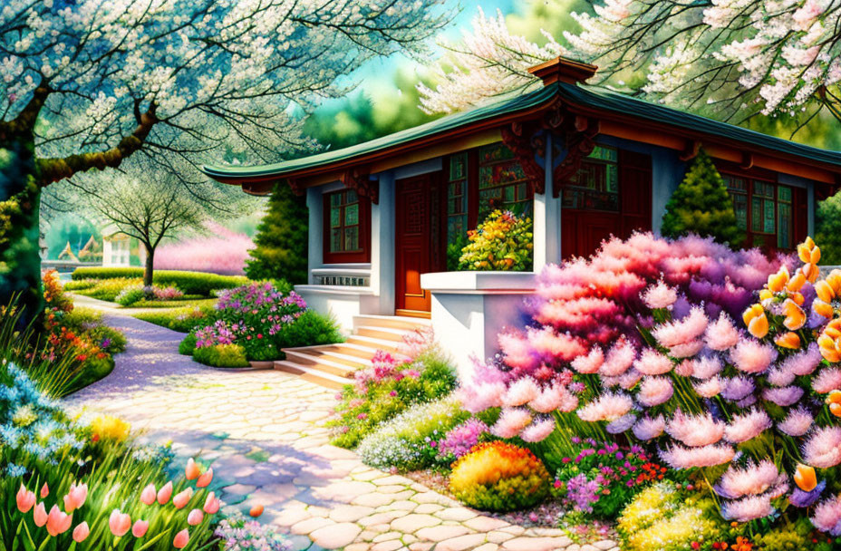 Traditional House with Red Facade in Colorful Garden