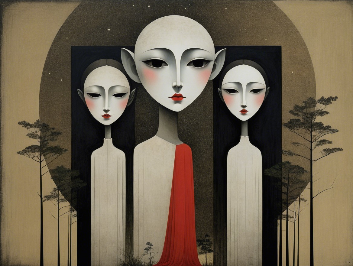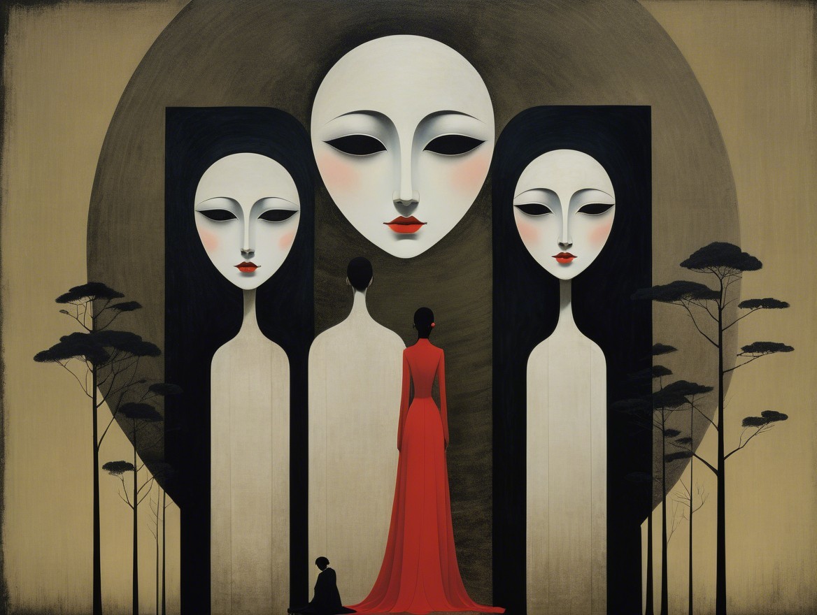 A mysterious scene features a figure in a flowing red gown standing before an archway adorned with three large, stylized masks. The backdrop includes silhouettes of trees against a twilight sky.