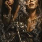 The image showcases a trio of striking women with long dark hair and dramatic makeup. They exude a bold and edgy vibe, adorned with tattoos and unique accessories, conveying a captivating and rebellious aura.