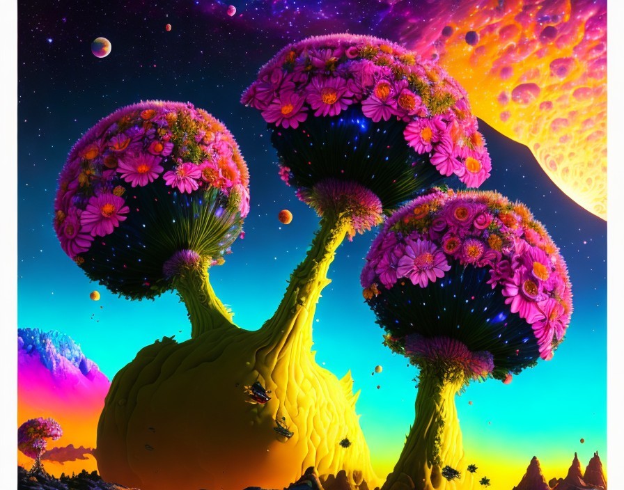Prompt: aliens living walking petal-flowers and fuzzy-seeds conquerors army at Mars, galaxy eternity, vibrant scene, unreal forms, dark martian landscape, sundown sky, interplay of light and darkness; by Junji Ito, codex Seraphinianus, codex Voynich, Arkhip Kuindzhi; ink art surrealistic fantasy painting; ink flowing splash art, extreme detail, oil on canvas, soft brush