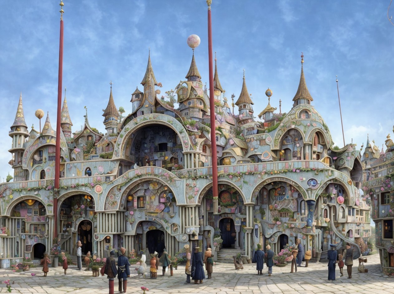 A whimsical, fairy-tale-like village with intricate, colorful houses adorned with towers and vibrant flora, under a clear sky with birds flying.