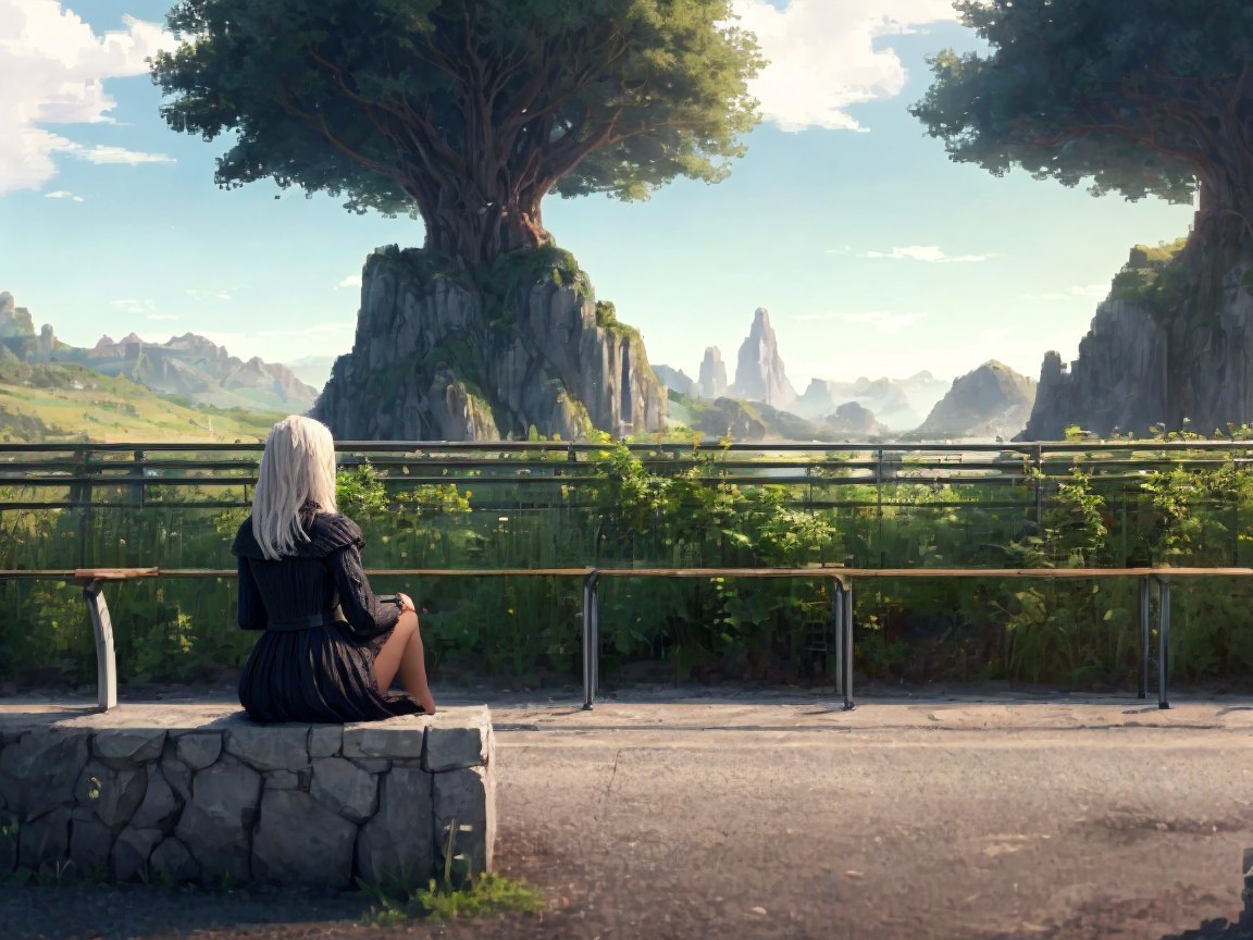 A serene landscape features a woman in a dark dress sitting on a bench, surrounded by lush greenery, mountains, and a quaint village, all bathed in warm, golden sunlight.