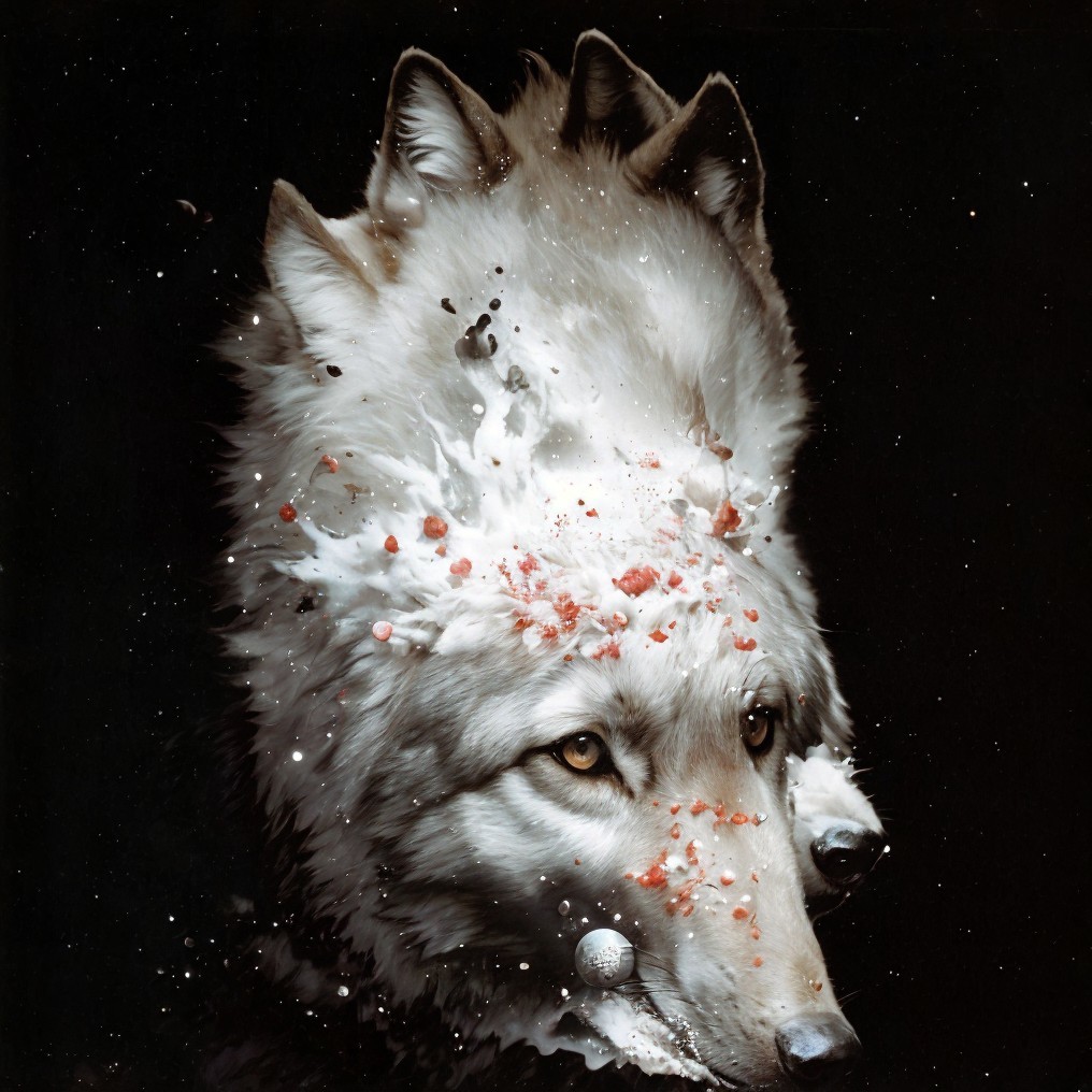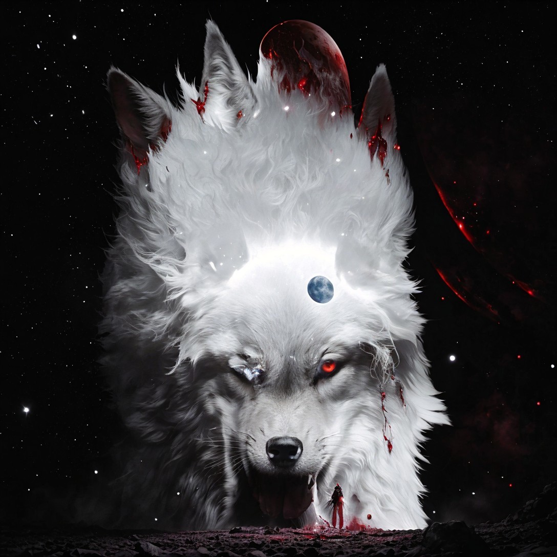 Person with glowing orb beside large wolf in dark canyon under starry sky.