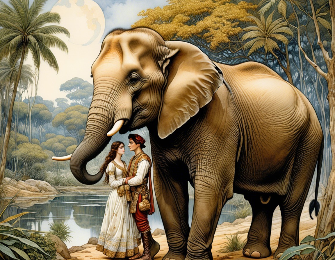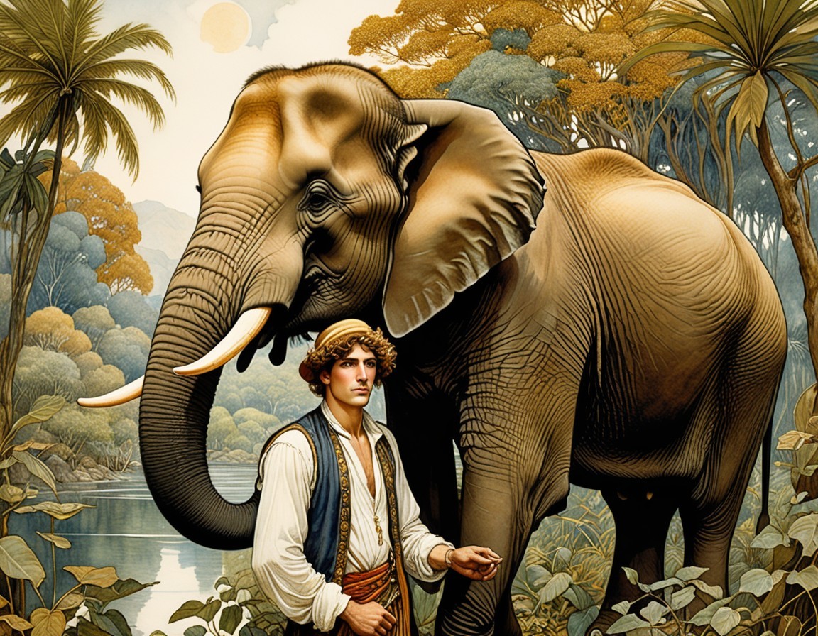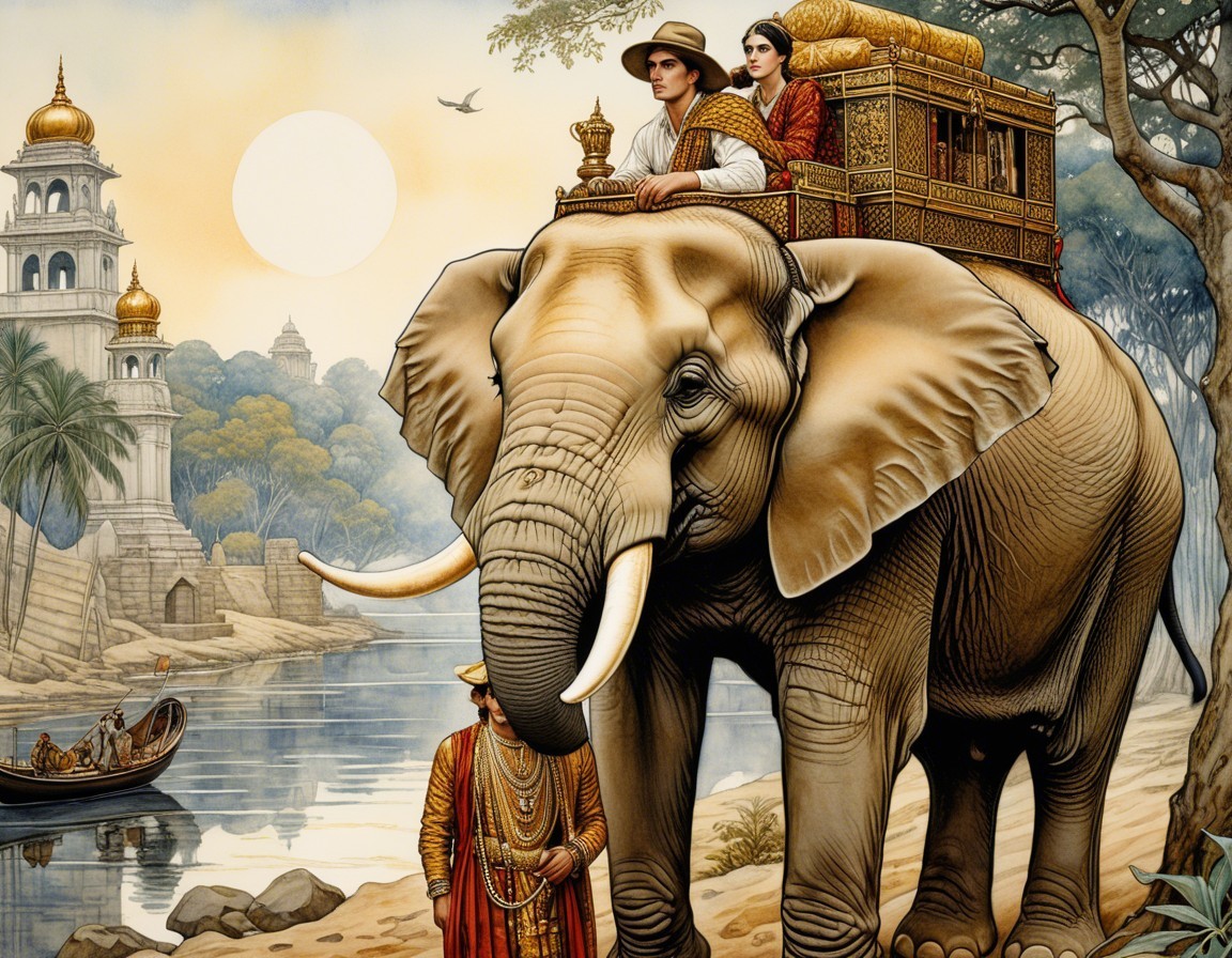 An elephant adorned with a decorative canopy carries passengers along a riverbank. A boat floats nearby, with a lush landscape and temple in the background, depicting a serene, exotic scene.