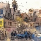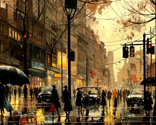 A vibrant street scene captures a vintage tram amidst pedestrians, cyclists, and children. Nearby trees with autumn leaves contrast the urban backdrop of houses and towering buildings.