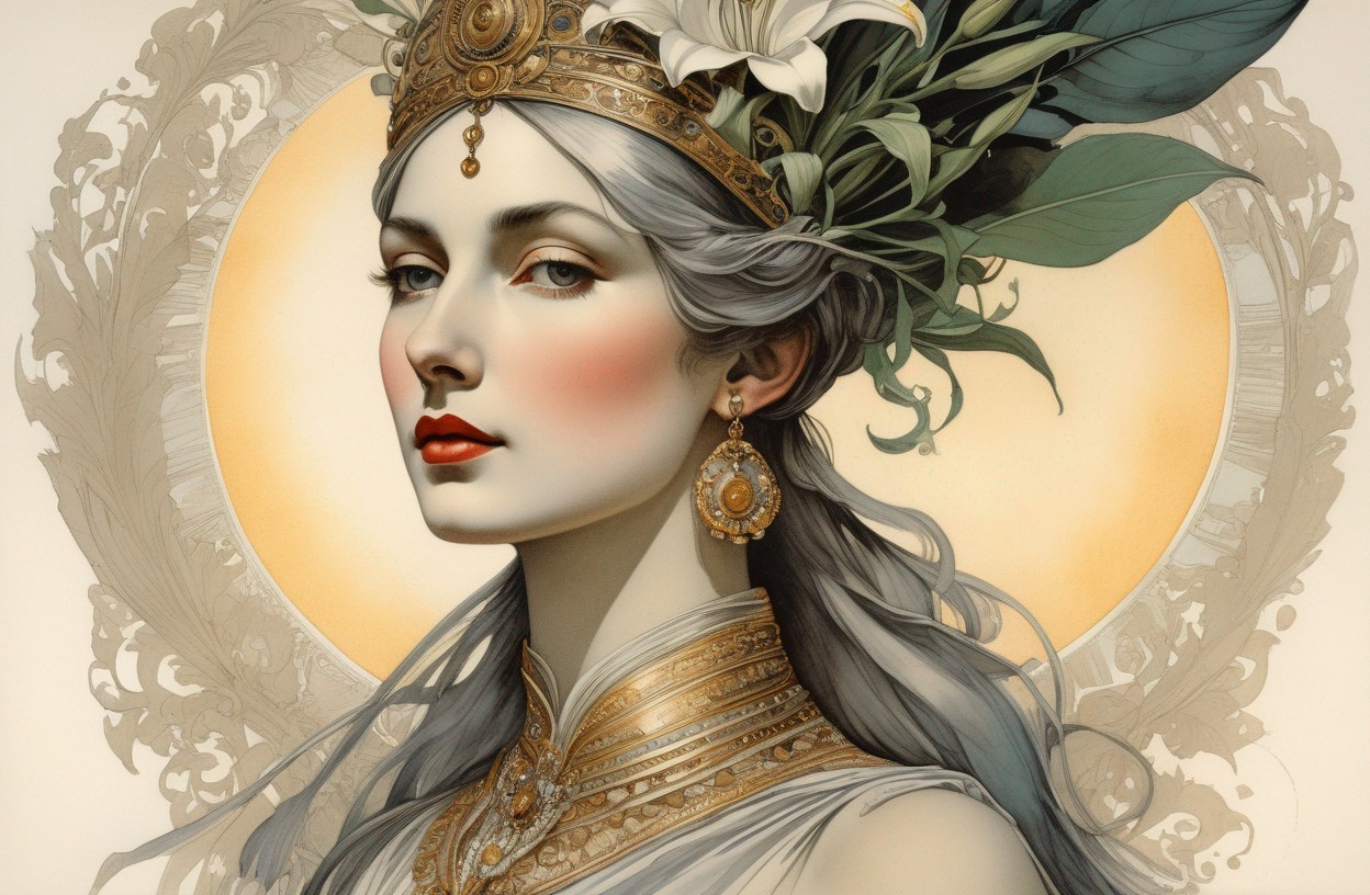 Beautiful woman in the style of WALTER MARTIN BAUMHOFER and rené gruau. high priestess of lilies. colored ink drawing, watercolor artwork on old withered paper, vintage, by Caravaggio, Fragonard, Anton Pieck, pale colors, high detail, intricately detailed, hyperdetailed volumetric lighting, art nouveau graphic steampunk., whimsical, beautiful, poignant, touching. colors rose, gold, rust, burgundy, black.soft watercolor extra water in Art Deco by Annigoni, Egon Schiele, Milo Manara, Botticelli, Catrin Welz-Stein, Jean Metzinger, Klimt, perfect eyes, perfect handsface, highly detailed, complementary colors, hyper detailed. Watercolor and ink splatter, dynamic pose, dark blue background, unreal engine, greg rutkowski, loish, rhads, beeple, makoto shinkai and lois van baarle, ilya kuvshinov, rossdraws, tom bagshaw, alphonse mucha, global illumination, detailed and intricate environment