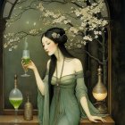 A serene woman in a flowing gown holds a glass, gazing thoughtfully. Soft floral decor frames her, and warm light bathes the scene, creating an ethereal, enchanting atmosphere.