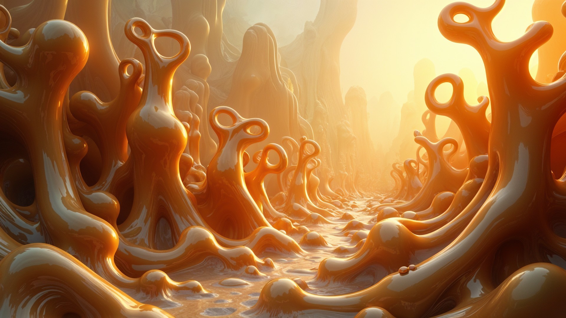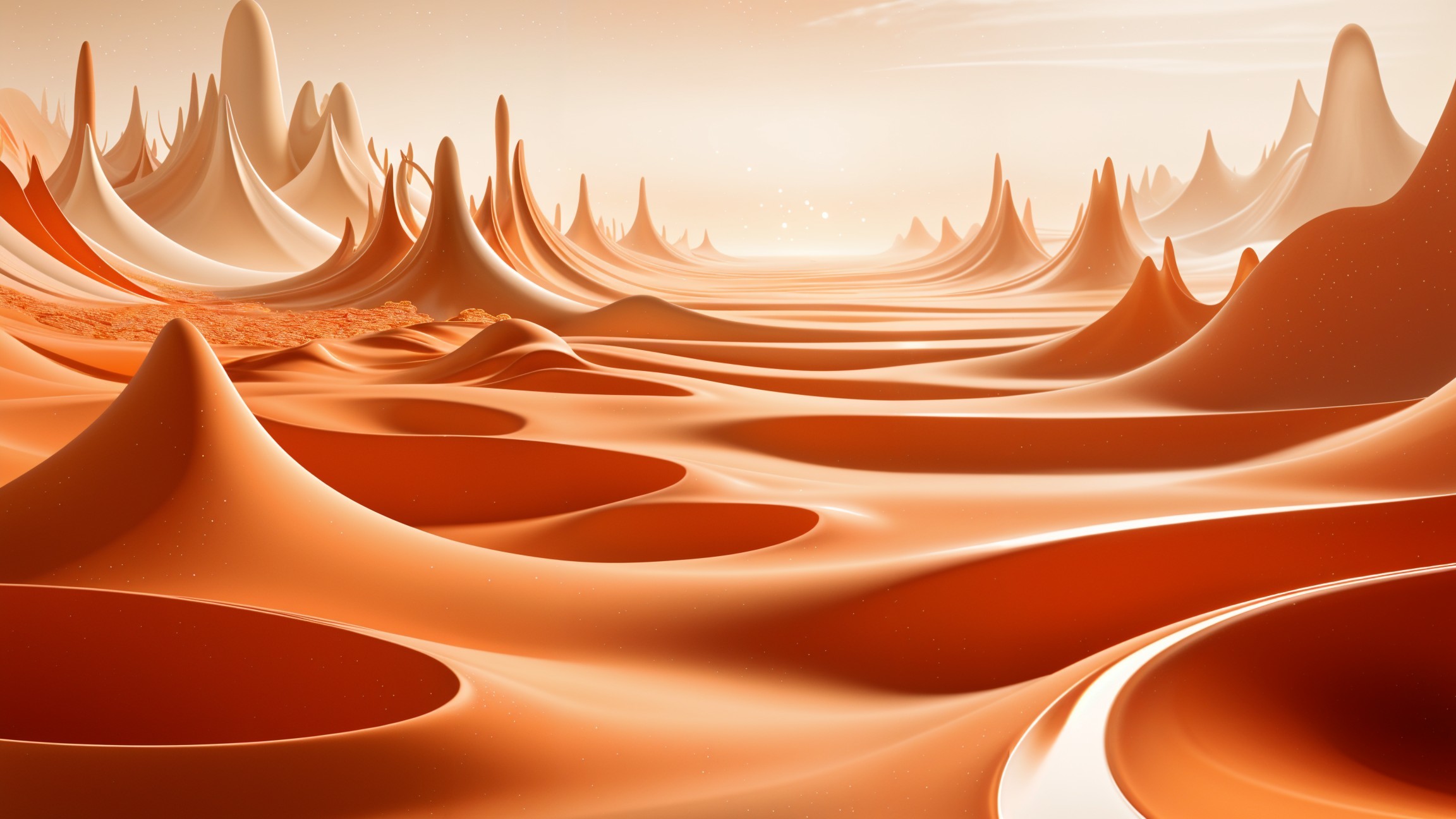 A surreal landscape features smooth, undulating terrain with towering, wave-like formations in warm, sandy tones, set against a soft, gradient sky. The scene evokes a dreamlike, otherworldly atmosphere.