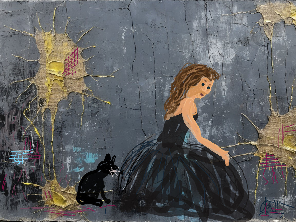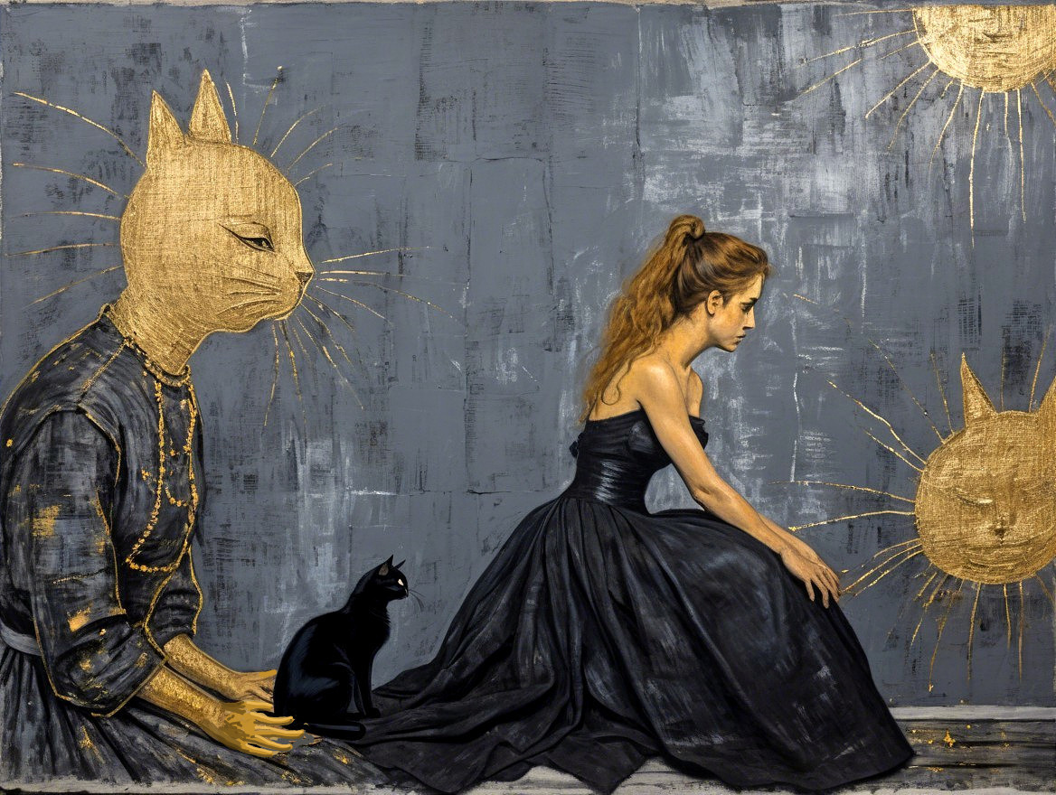 Ancient dark gray wall painted with gloss varnish with many golden scratches, a seated woman, paintet by Gustave Caillebotte with curious look to you in a long flowing dress, a black cat and a big golden dark dressed teacher cat behind her, abstract grunge texture of coarse burlap, added pigment enamel, with small cracks, muted dark tones in silver-gray, golden lines, delicate blue lines, green, violet and yellow threads, black weathered glaze, antique, weathered, crumbling, protruding chips, holes, faint grain, invisible horizon, extremely detailed,the wall in the style of Jean-Michel Basquiat