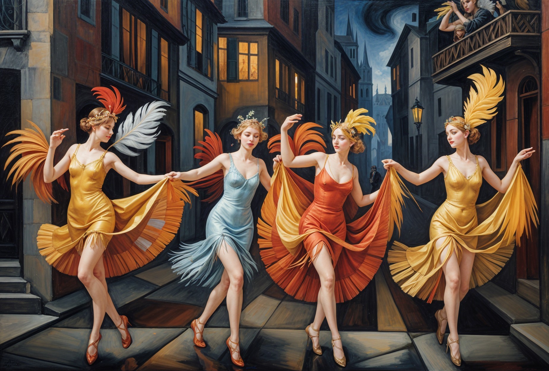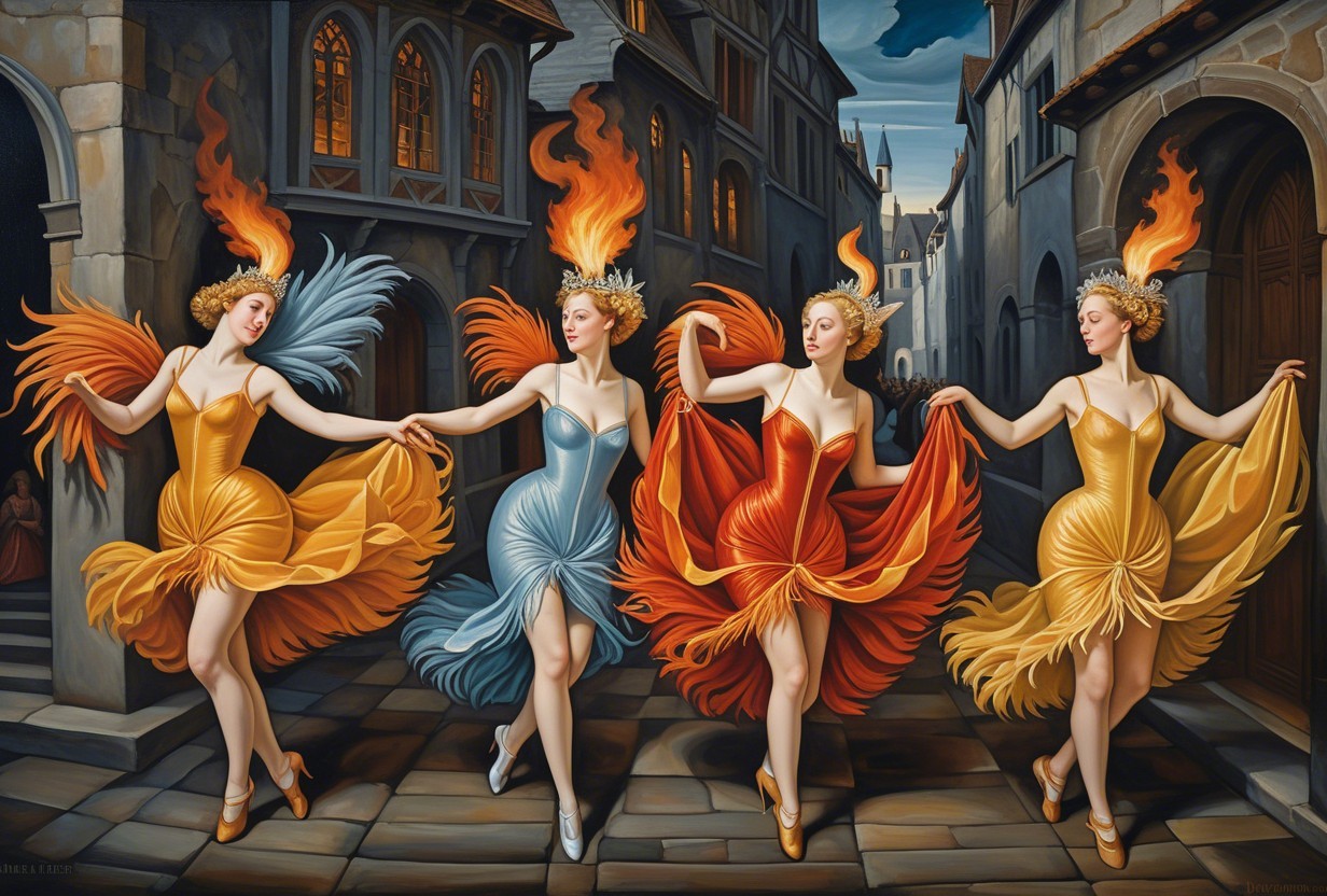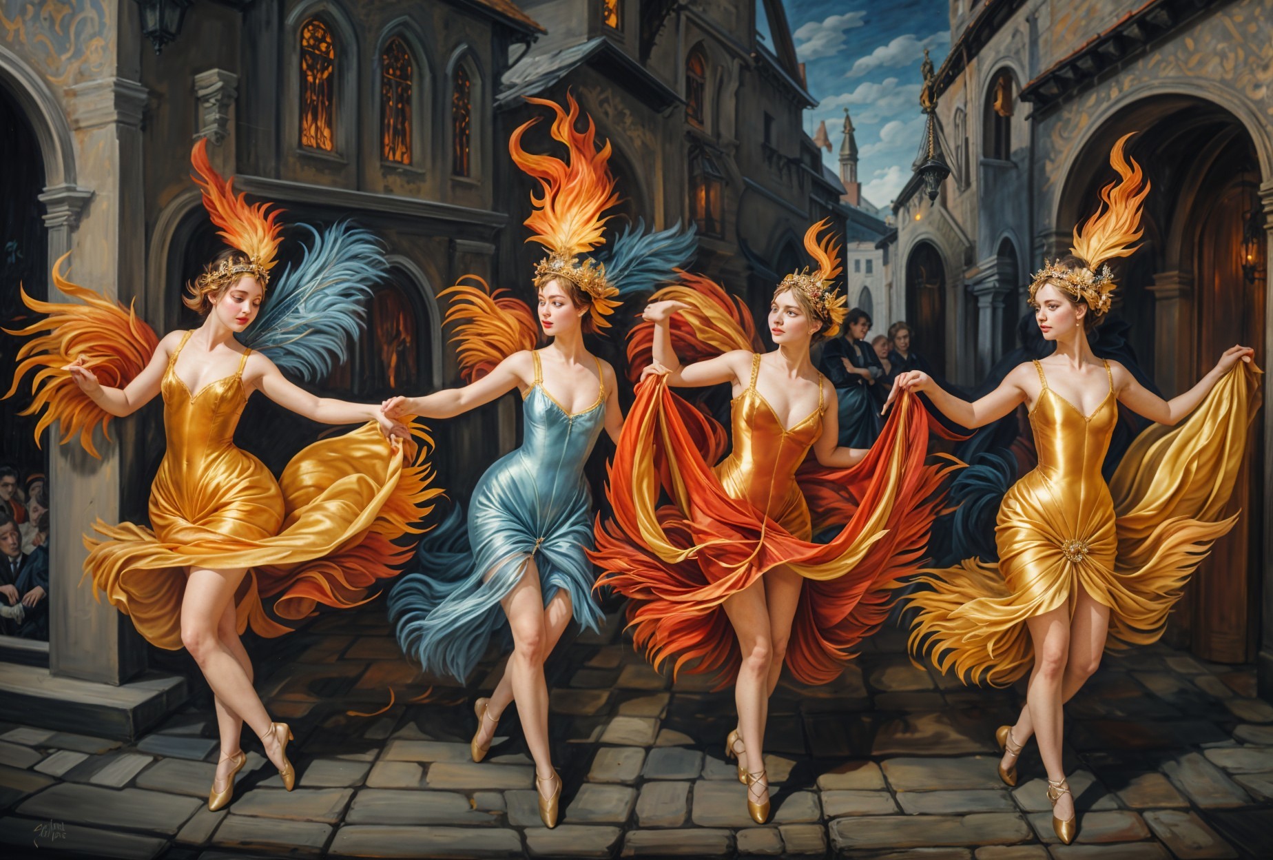 Prompt: A stylized oil painting on canvas depicting the surreal and tragic moment of the "Bal des Ardents" at the medieval French court. Six dancers, caught mid-movement, are engulfed in stylized, flowing flames that curl like ribbons around their bodies. They wear exaggerated, textured costumes made of feathers and clumps of tow (flax fibers), now partially singed and sticking to their limbs. The figures are elongated, their gestures theatrical, as if performing a macabre ballet. Around them, shadowy figures of courtiers in 14th-century dress recoil in slow motion, their faces distorted by shock. The background is a warm, rich brown with swirling patterns, adding a dreamlike, almost feverish atmosphere. The entire composition is dynamic and abstract, with brushstrokes that convey motion, chaos, and the surreal horror of the burning dance.. A vibrant Cubist oil painting of four elegant women from the Roaring Twenties walking confidently down a lively street. They wear glamorous 1920s flapper dresses with intricate beading and fringes, feathered headbands, and stylish heels. The scene is full of geometric abstraction, with vivid colors, angular forms, and expressive brushstrokes evoking a festive city atmosphere. No umbrellas are present, and the figures move with dynamic, joyful energy. A fantastic illustration depicting four fairies gathered under a huge twisted tree with thick dark green bark and intricate intertwined branches that occupy the entire frame. Fairies have long flowing hair in golden brown and amber yellow shades, decorated with intricate floral crowns of blue, green and purple tones. They are dressed in ornate dresses with delicate patterns and flowers matching their crowns: one is light cream, another is golden yellow, the third is sky blue, and the fourth is dark green. Their outfits blend seamlessly with the surrounding vegetation, creating a harmonious and magical atmosphere. The central fairy stands slightly ahead of the others, her dress elegantly flowing as she holds out her hand. To her left, a fairy in gold is carefully examining something that another fairy is holding. To the right, in the far corner, the fairy in blue seems to be immersed in deep thought or prayer. The action takes place in an enchanted forest, where bright sunlight penetrates through the foliage, giving the landscape a soft, unearthly glow. Small creatures resembling bats, birds and foxes are scattered everywhere, which creates a mystical atmosphere. In the background there is a dense forest area with trees bathed in soft light, which creates depth and enhances the fabulous image quality. Various small animals and plants, including butterflies and lavender flowers, create a whimsical setting.