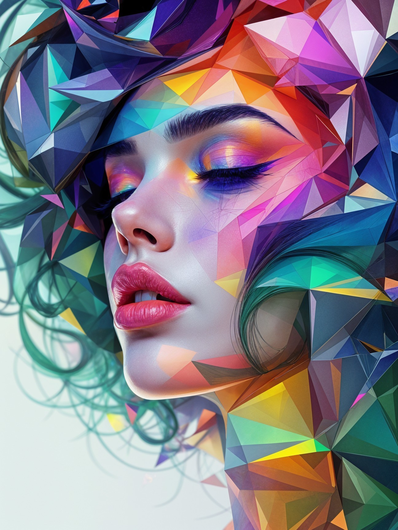 The image showcases a striking, abstract portrait of a woman with a colorful, geometric design. Vivid hues blend beautifully, highlighting her features and creating a captivating, artistic effect.