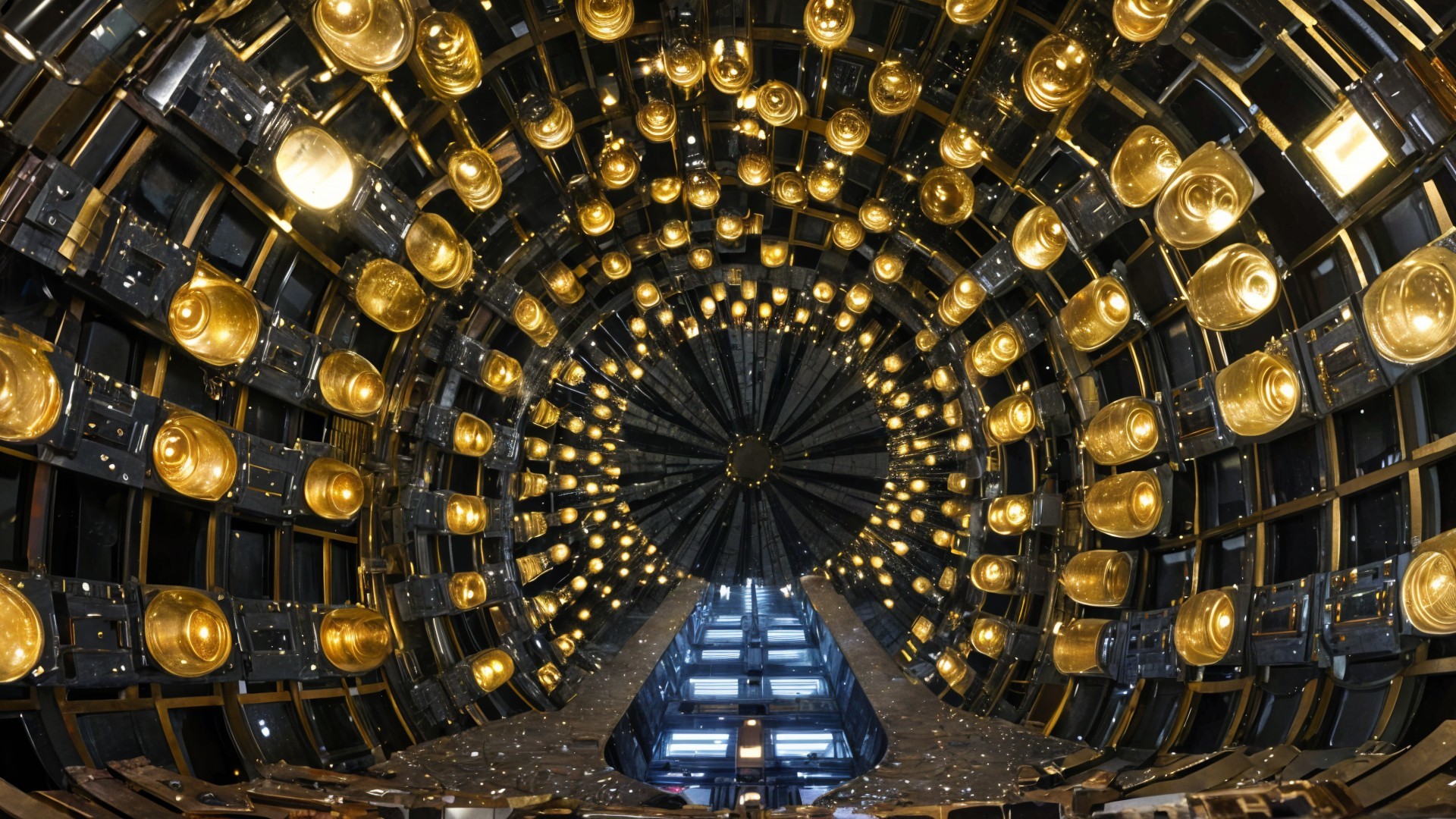 The image depicts an intricate circular ceiling adorned with glowing golden fixtures. The view looks upward through a series of concentric circles, creating a captivating, luminous effect.