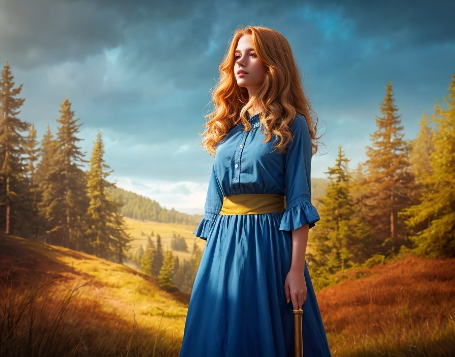 Prompt: "Oil and Canvas, a little girl with blond reddish wavy hair in a blue cotton dress who is standing on the top of a tall grassy mound in the forest, she is ringing a huge golden bell placed way up in the sky, landscape mode, forestry, moody trees, mystical surroundings, panoramic view, little girl with blond reddish wavy hair in a blue cotton dress is standing on the top of a tall grassy mound, she is ringing a huge golden bell situated up in the blue beautiful sky, landscape mode, forestry, moody trees,"