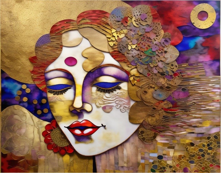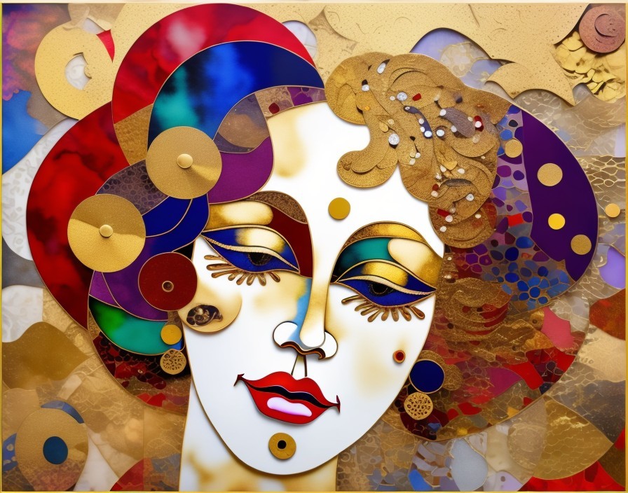 Abstract, colorful artwork featuring a stylized female face with geometric shapes and vibrant patterns on a golden background.