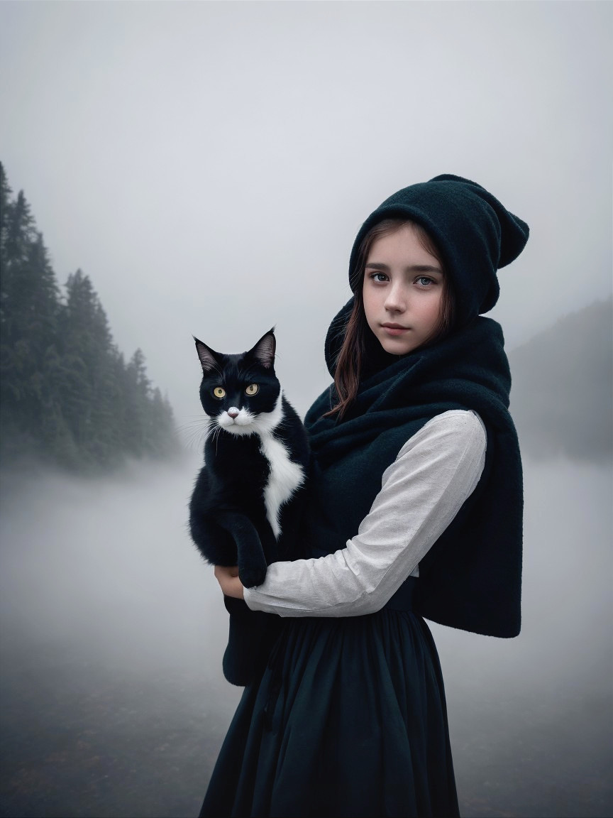 A young girl in a dark hooded garment holds a black and white cat. Surrounded by a misty forest backdrop, her expression is thoughtful, creating a mysterious and serene atmosphere.