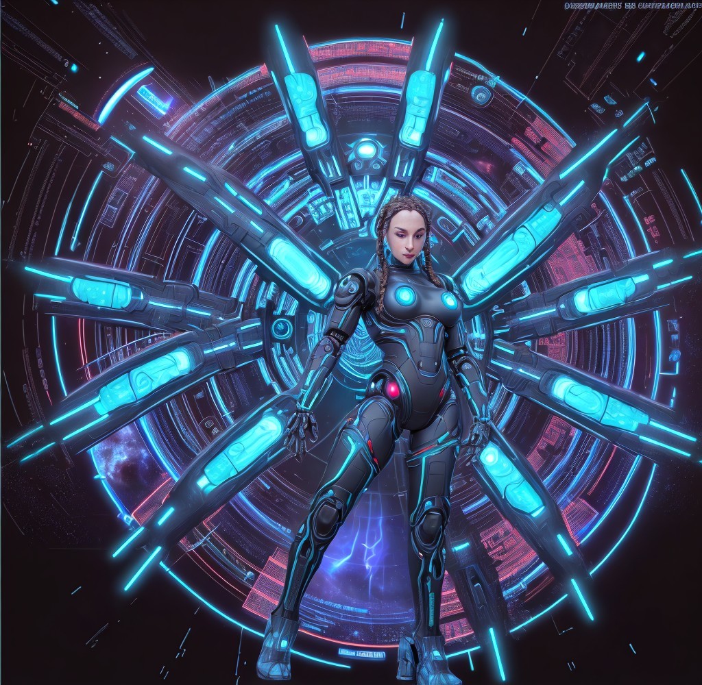 + Prompt:Science-fiction art, Android, Full body shot, Space raider, Full body, robotic suit, mechanical fittings, bioluminescent glowing garment, brown braids, futuristic Spaceship interior. LEDs, wires, electrical components,
