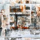 A vibrant city street scene featuring vintage cars, pedestrians, and elegant architecture. The watercolor style highlights reflections and soft colors, capturing a nostalgic urban atmosphere.