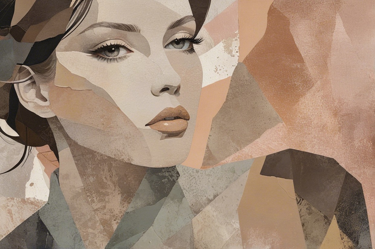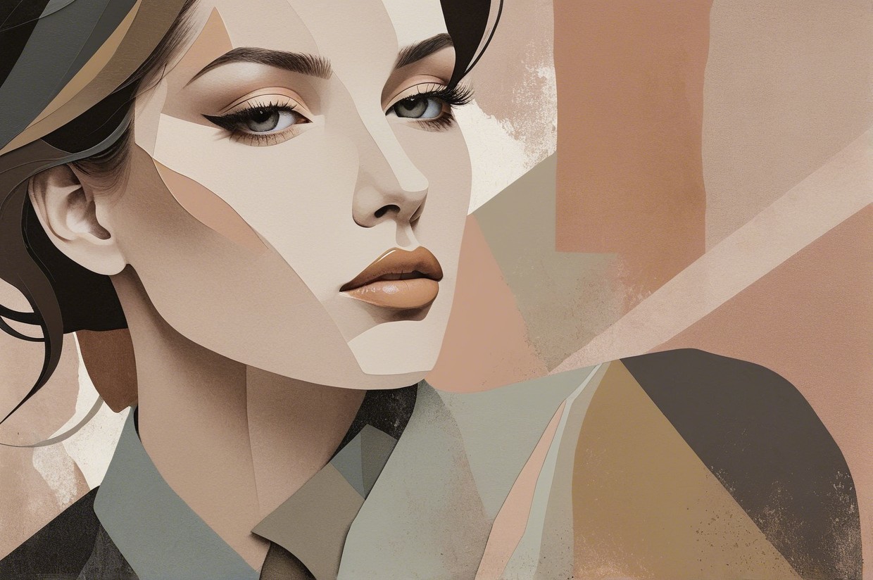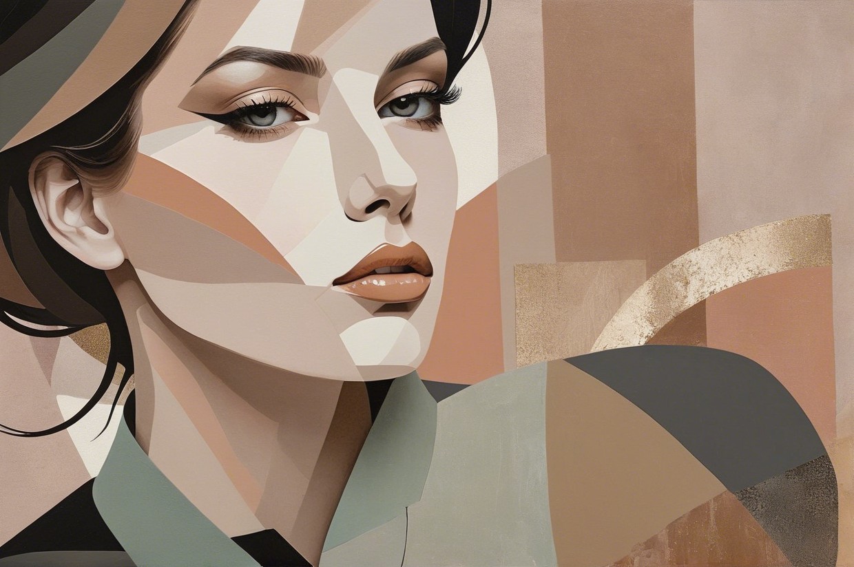 An abstract portrait of a woman with striking features, combining soft browns, green, and tan hues. The geometric shapes and subtle textures create a modern artistic flair.