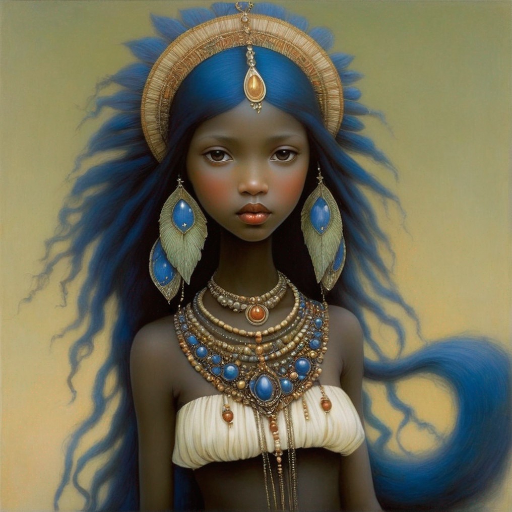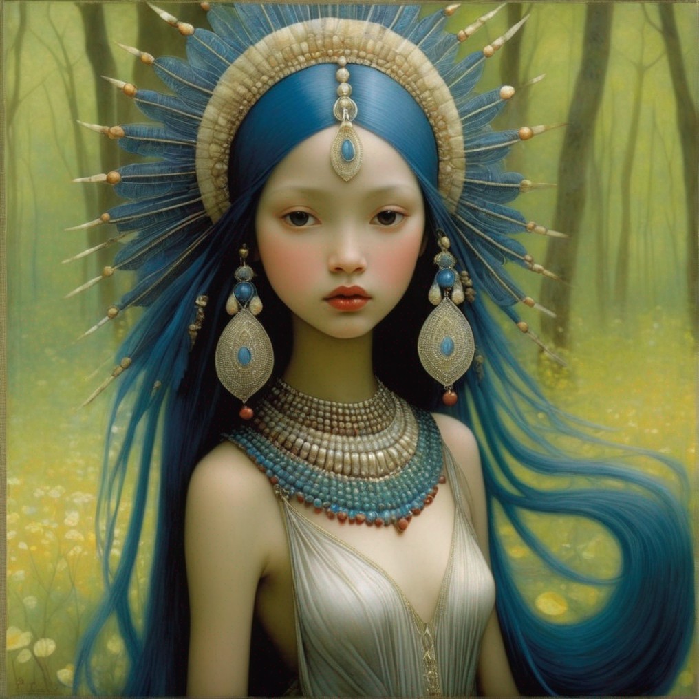 Ethereal character with blue hair in floral wreaths and jewels gazes serenely amid green