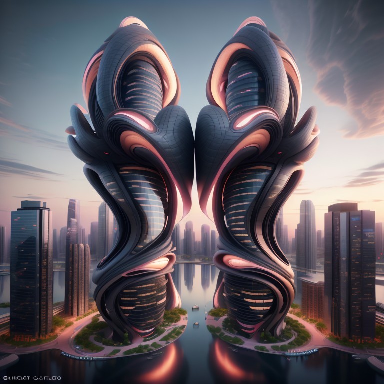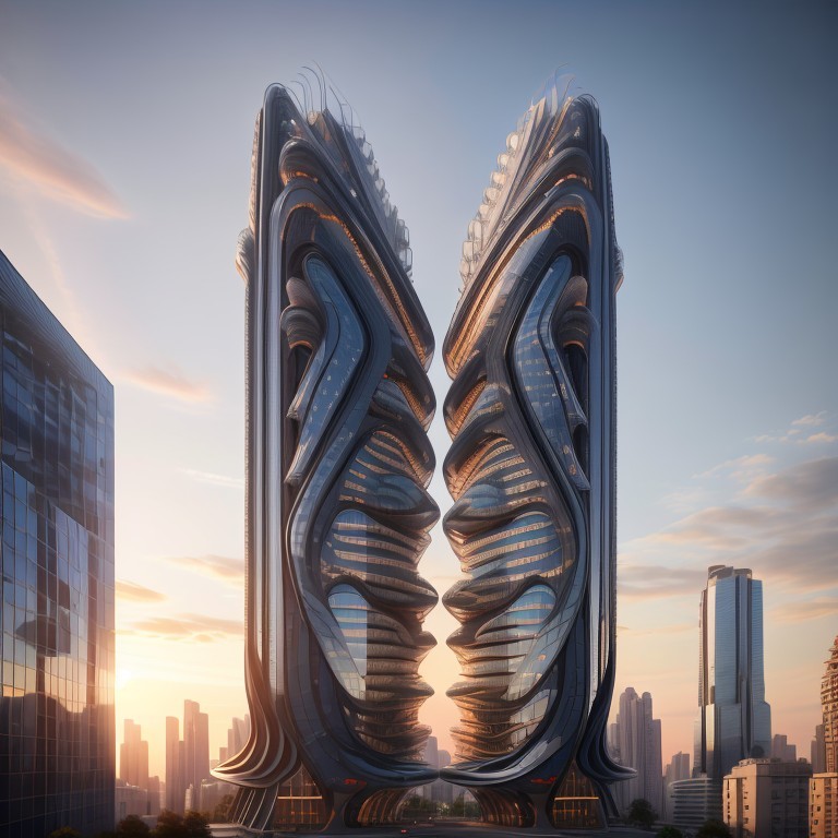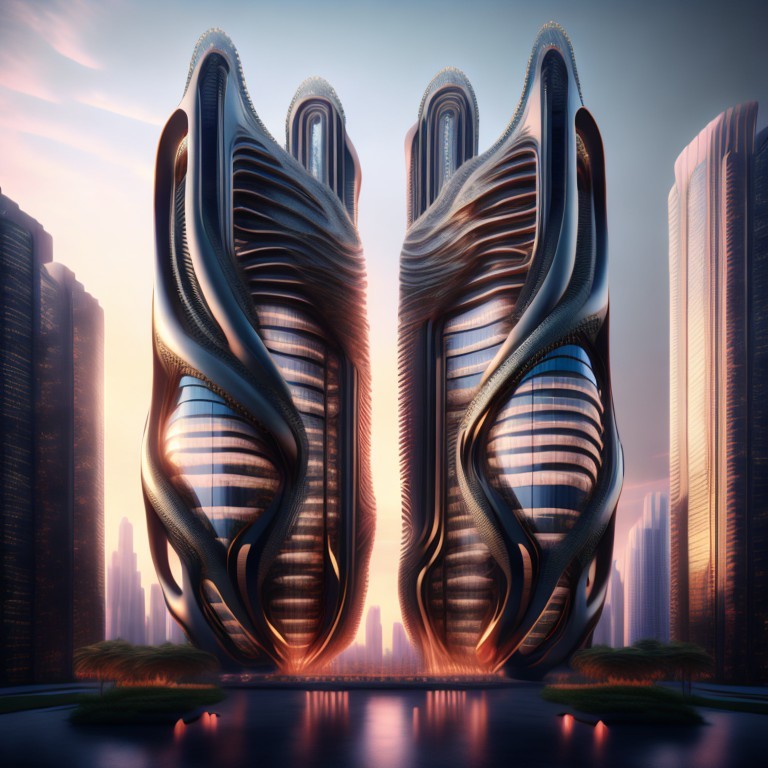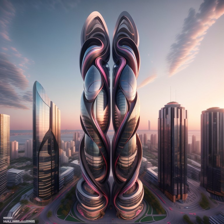 Futuristic skyscrapers with a sleek, curved design rise above a modern cityscape at dusk, reflecting a colorful sunset.