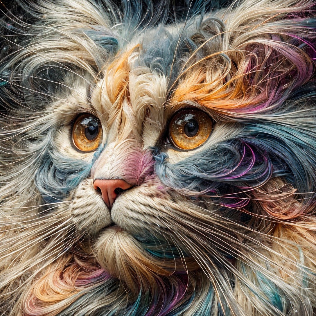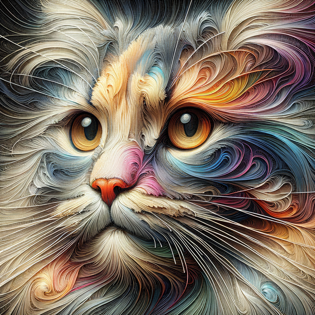 (Try it from The Mad Hatter) - A detailed, colorful digital artwork of a cat with swirling patterns and intricate textures.