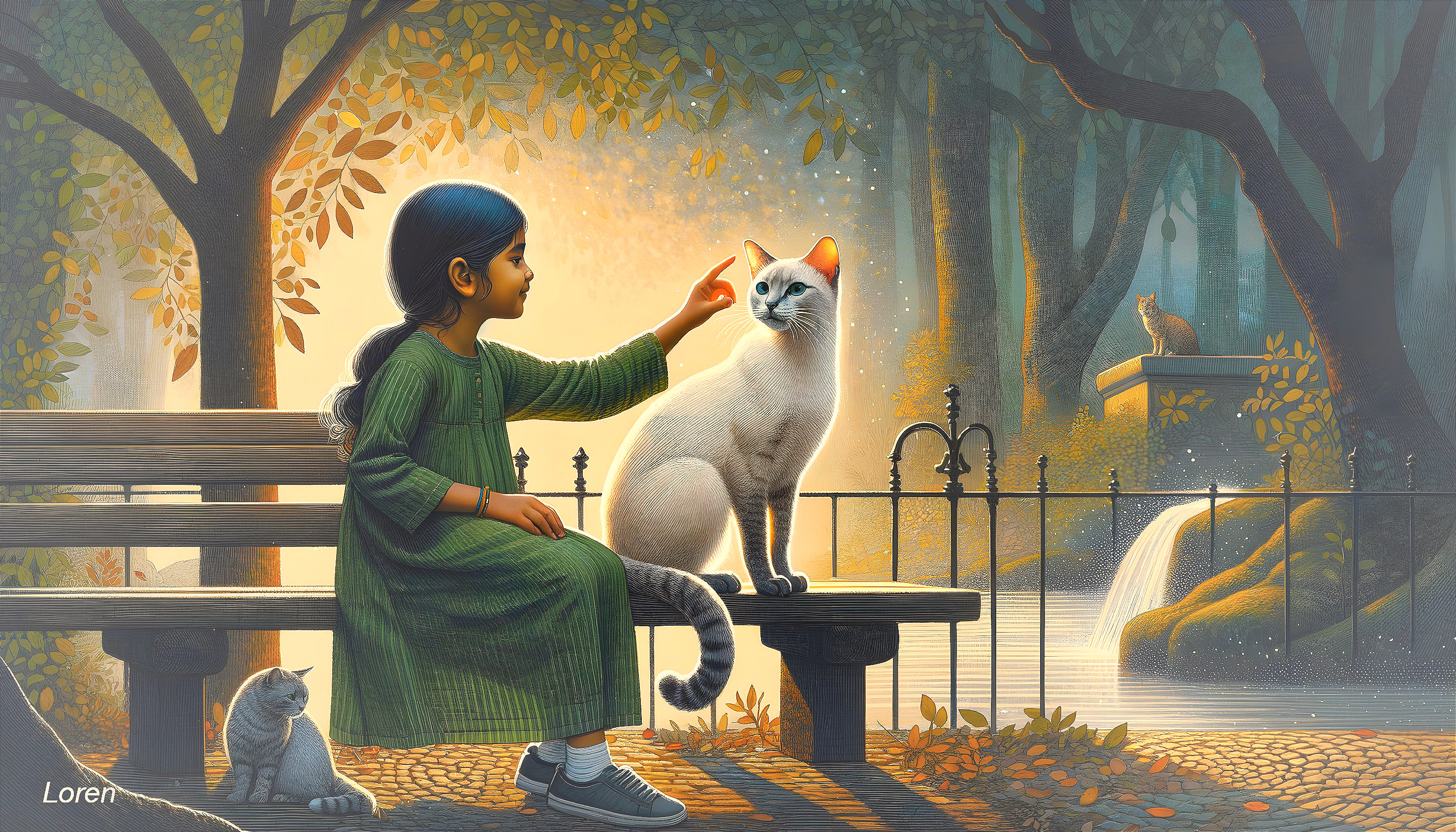 A girl gently pets a large, white cat on a park bench amidst autumn trees, with a fountain and a squirrel in the background.