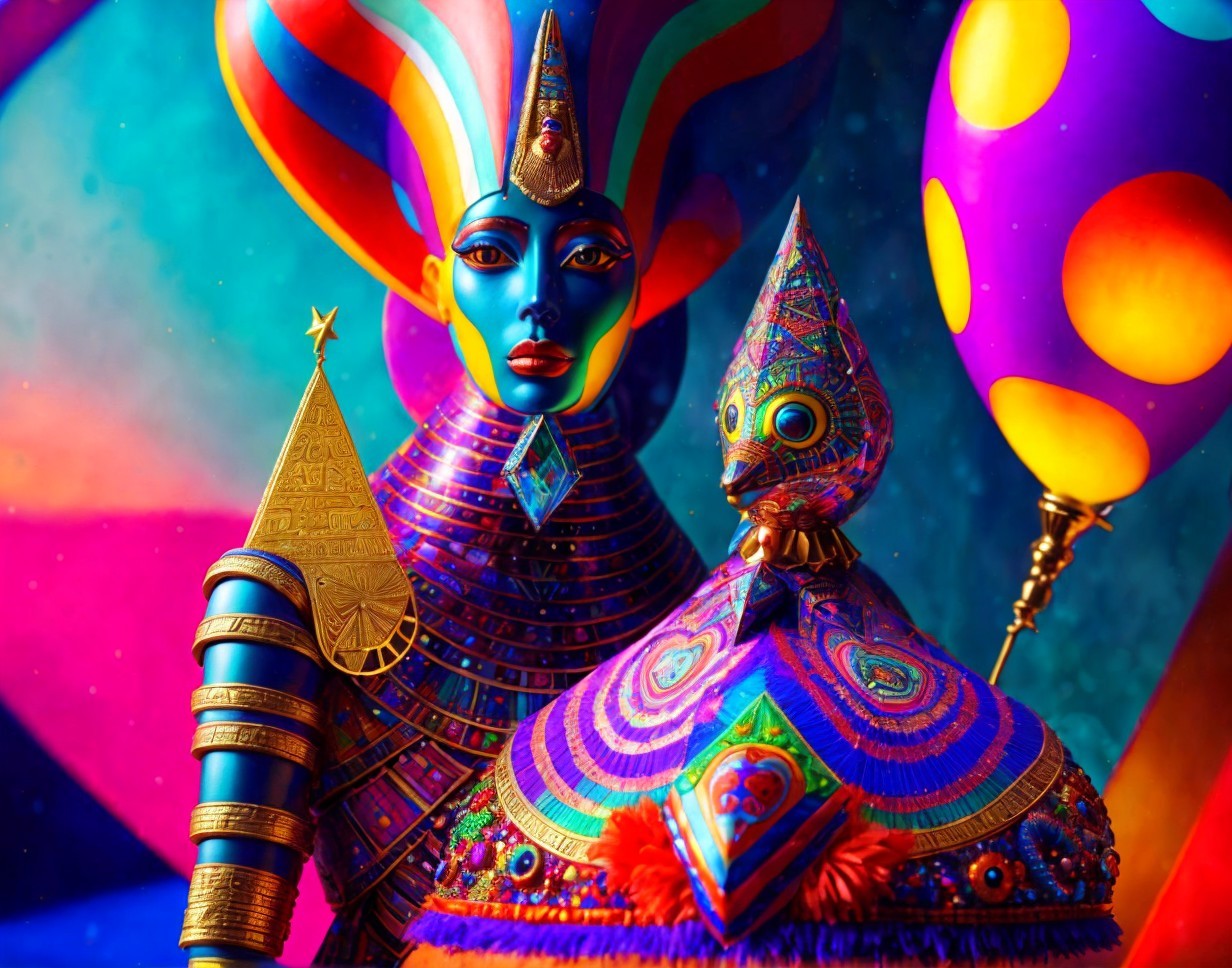 Colorful figurines with intricate headdresses and patterns against a backdrop of multicolored balloons