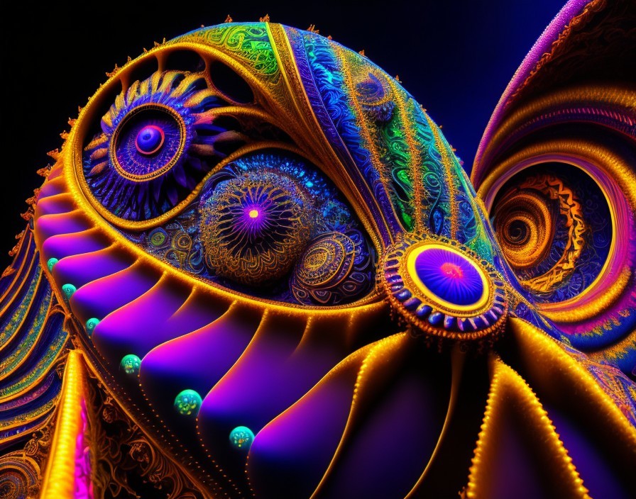 Vibrant digital artwork featuring intricate, psychedelic patterns and swirling shapes in bold purple, orange, and blue hues.