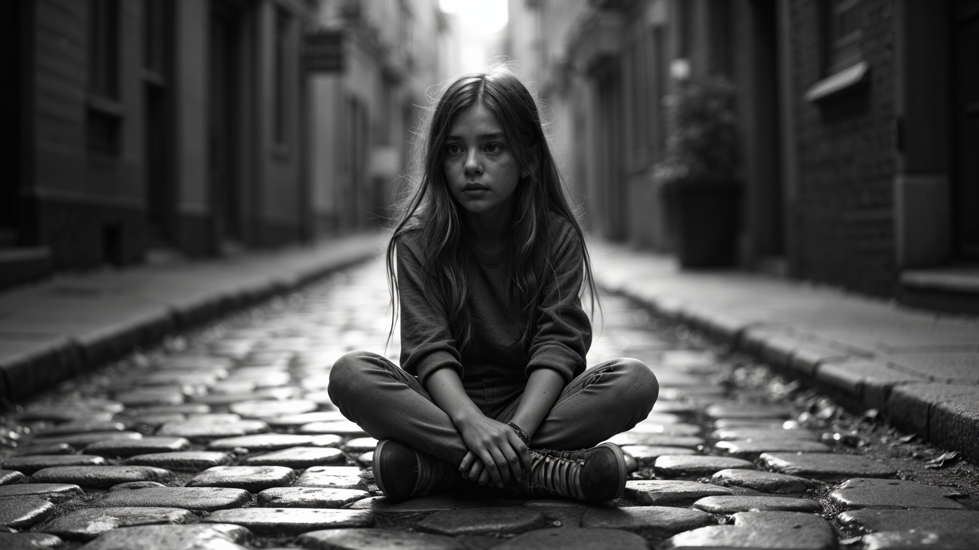 A girl sits cross-legged on a cobblestone street, surrounded by quiet, atmospheric surroundings. The black and white tone enhances the mood of reflection and solitude.