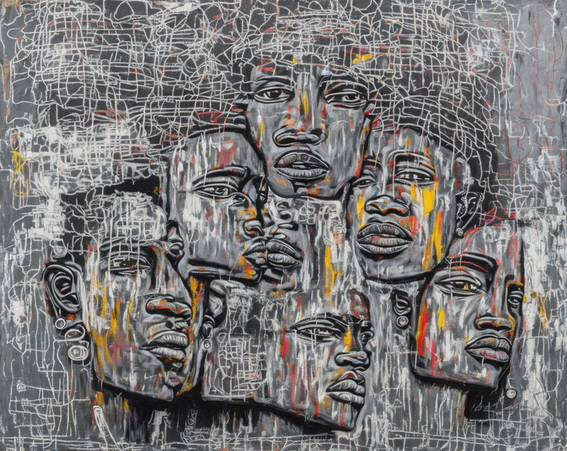 + Prompt:Abstract line art, Basquiat-inspired, half-relief sculpture, heads, people hugging each other, family, rough carved texture, dark expressive eyes, weathered appearance, generations depicted (mother, father, grandfather, child), embracing poses, integrated into rock, dynamic composition, raw emotion, cultural references, contemporary twist, intricate details, mixed media elements, urban art influence.