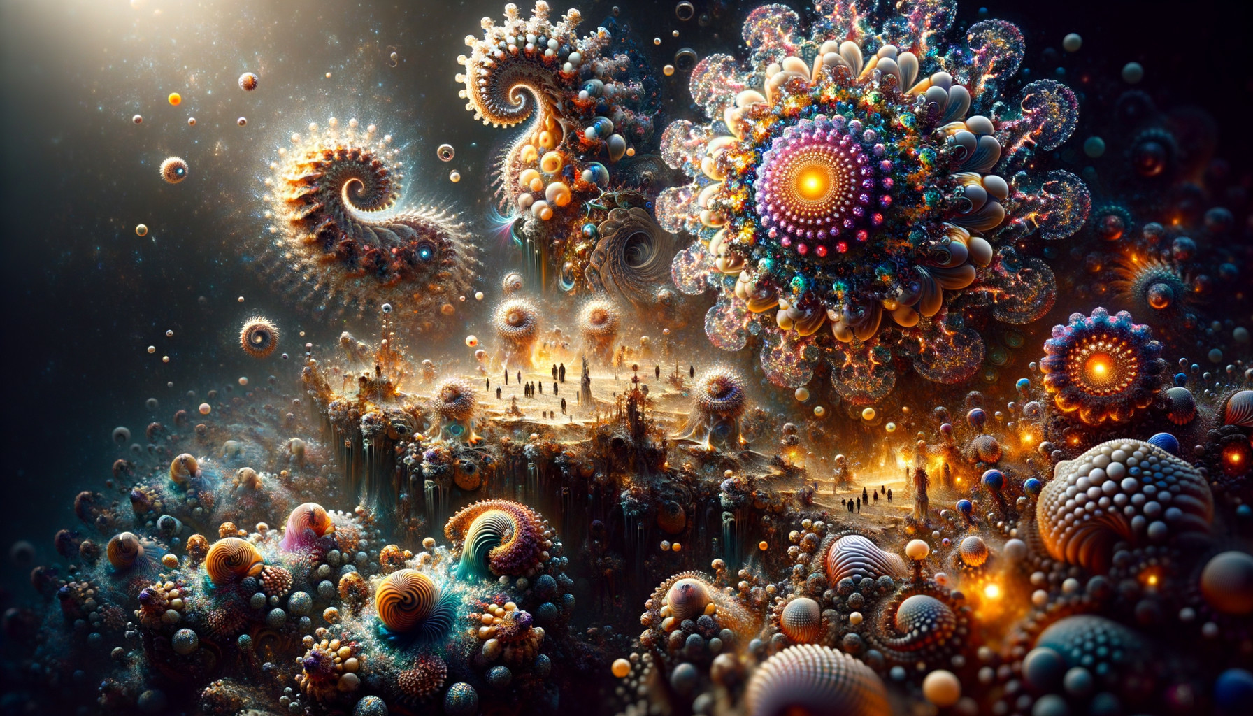 Prompt: "(start from a single point and incrementally grow an ebullient organically inorganic creature composed of highly-probable impossibilities predicated on the reality of quantum erasure and unlimited parallel realities) - resulting in covertly depressed lone independent hive (hedonauts jumping in jubilation) - as (a rhythmic wave function of love and ambivalence pours over the particle duality of light lunches on the riviera) - extolling decadently humble origins of sensate numbness creeping upward as (octopi return to their mountainous spawning pools by volcanic suboceanic vents covered in Koch crystalline madness)"