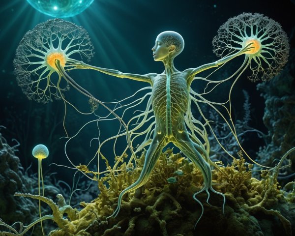 Teal-suited man in vibrant ornate corridor with red and blue tones