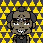 A male Klingon dressed in a dark, ornate robe sits comfortably in a plush chair, holding a cup. The backdrop features a striking geometric pattern of triangles in black and gold, adding to the elegant setting.