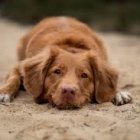A fluffy, reddish-brown dog with striking blue eyes lies on a sandy path. Surrounded by grass and fallen leaves, it looks attentively at the camera, showcasing its playful yet gentle demeanor.
