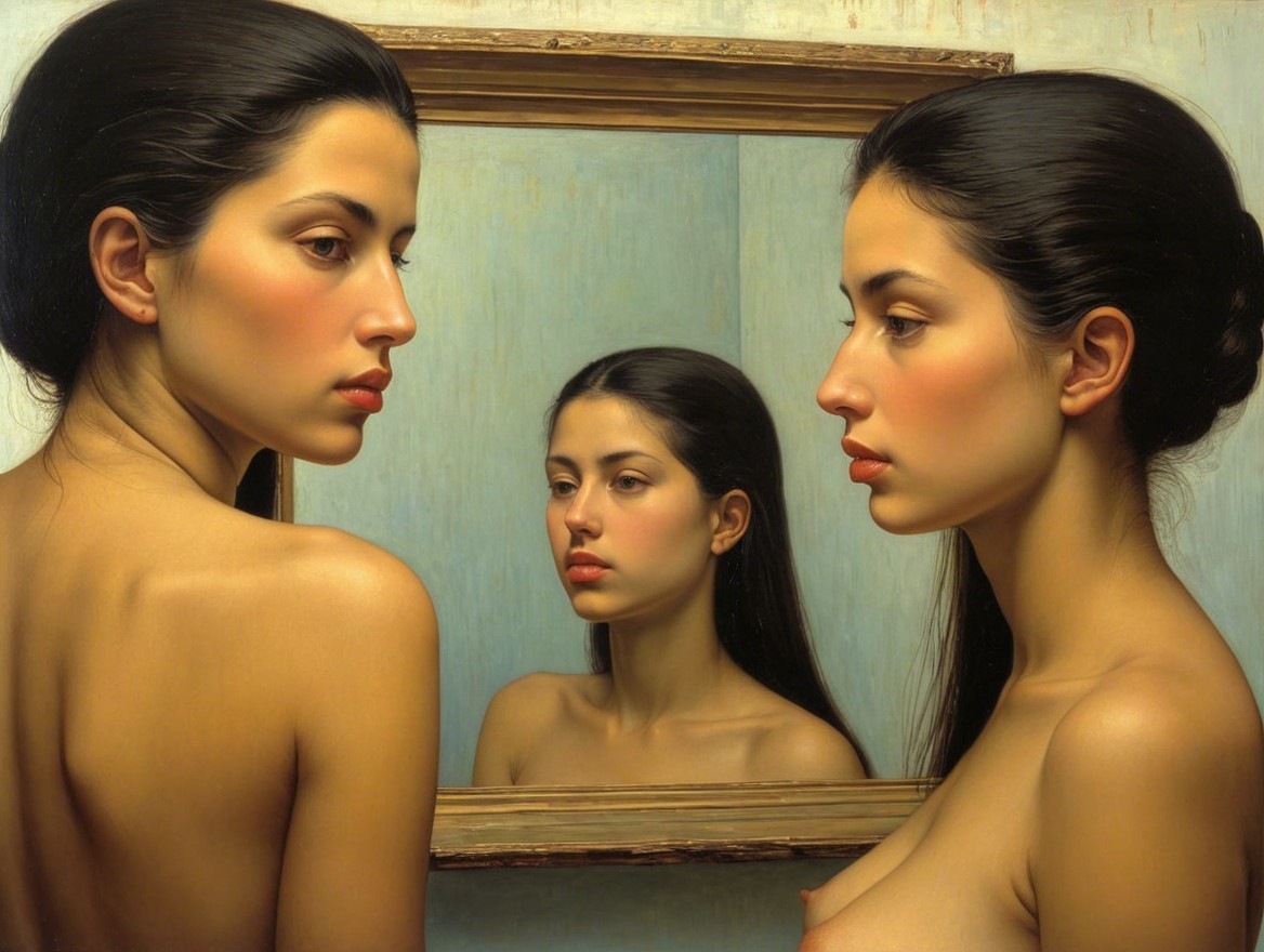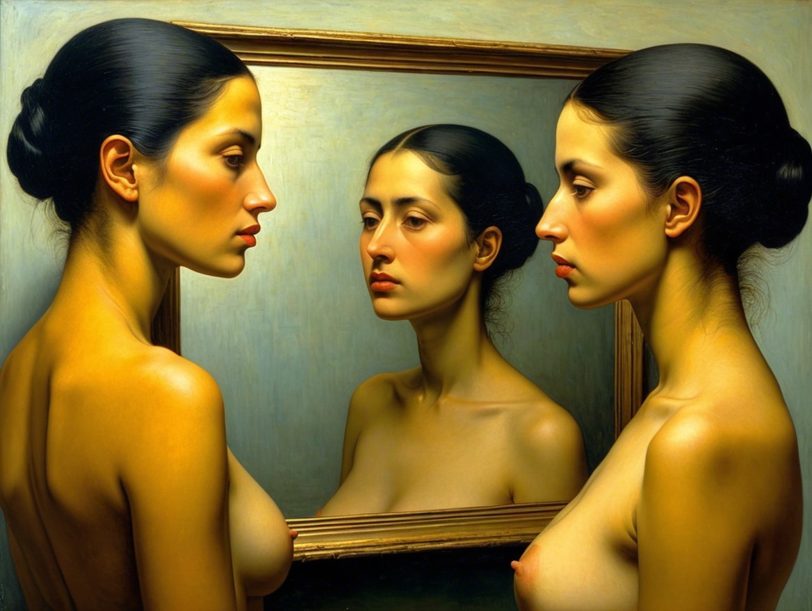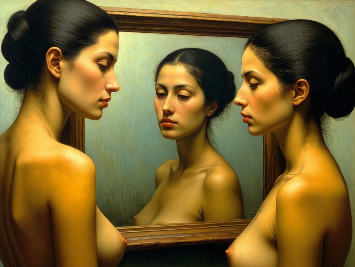The painting features two women facing each other, with one reflected in an ornate mirror. Their smooth skin and serene expressions evoke a sense of introspection and duality.