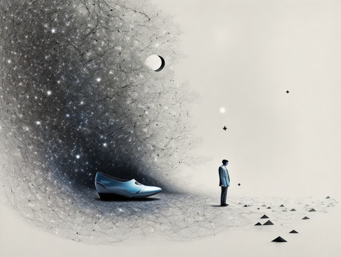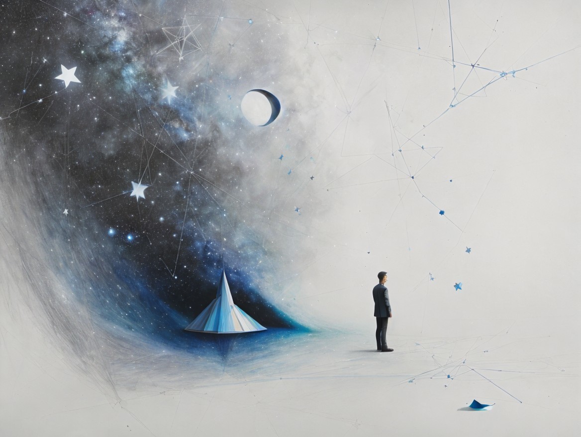 A surreal scene depicts a giant eye against a cosmic backdrop filled with stars and planets. A man in a suit stands with a cane beside a small girl, evoking themes of perception and wonder.