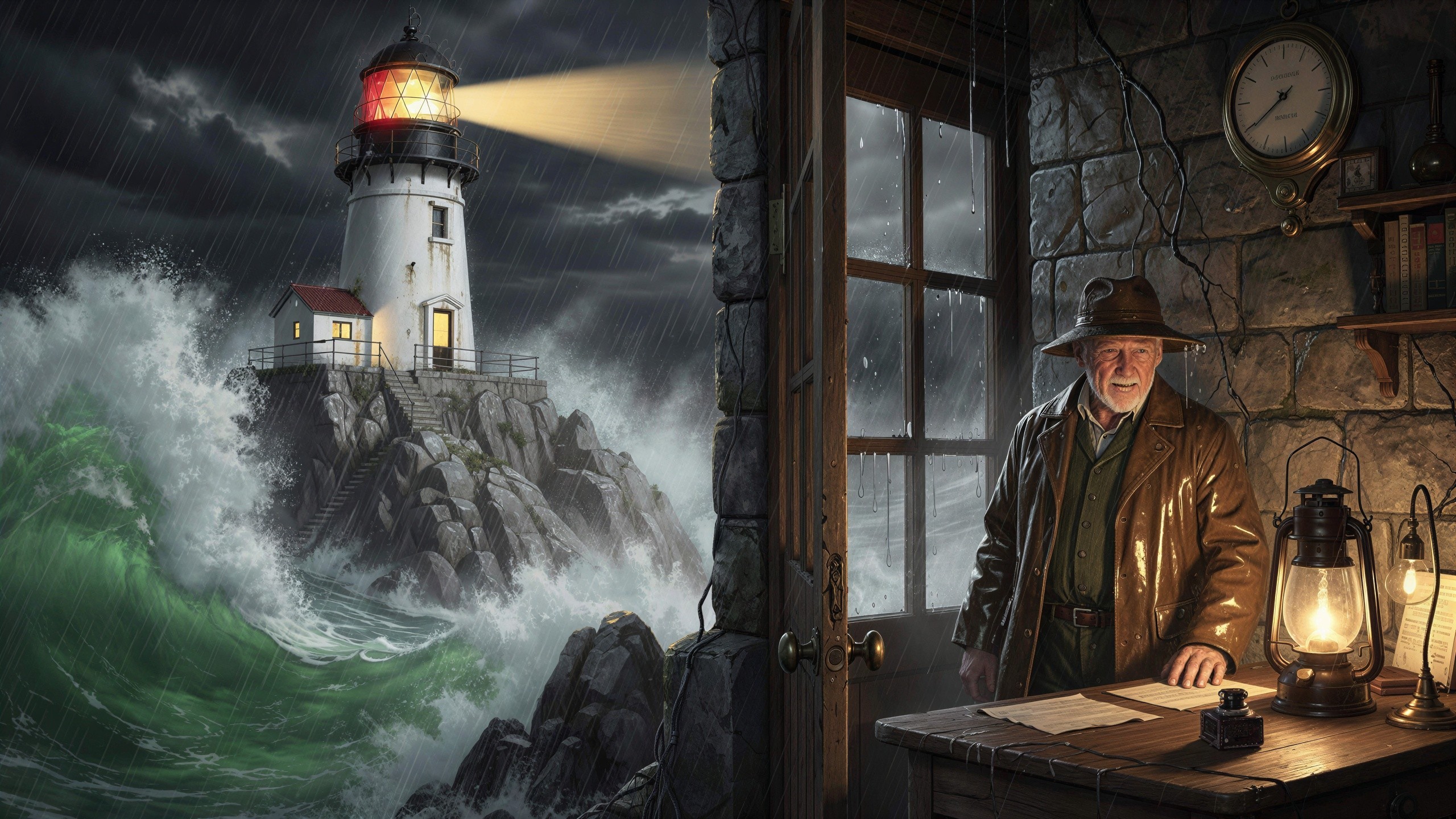 I have made my rounds, my oilskin crackling like parchment against the onslaught. The light turns, steady and sure, its great Fresnel lens cutting through the murk. To keep that beam alive is my singular purpose. Somewhere out in that chaos, men cling to their decks, their eyes straining for that very glimmer. The thought alone steels my nerve.