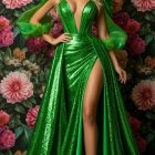 A glamorous figure stands confidently in a shimmering green gown with dramatic puff sleeves and a thigh-high slit, surrounded by lush greenery and soft golden accents.