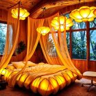 A cozy, enchanting bedroom designed with warm wooden walls and large windows overlooking a lush green forest. The room features a bed with a fluffy white duvet and a unique headboard resembling a large flower with petal-like edges. Suspended above the bed are multiple soft, glowing pendant lights shaped like flowers, casting a warm yellow light throughout the space. Sheer, flowing curtains drape around the bed, creating a serene and intimate atmosphere. Potted plants are placed strategically around the room, enhancing the natural feel, while a minimalist desk with a white chair sits in one corner, completing this inviting retreat.