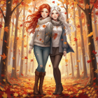 Two friends stroll through an autumn forest, surrounded by colorful leaves. One wears a cozy sweater and skirt, while the other sports a brown jacket and jeans, both smiling as they enjoy the scenery.