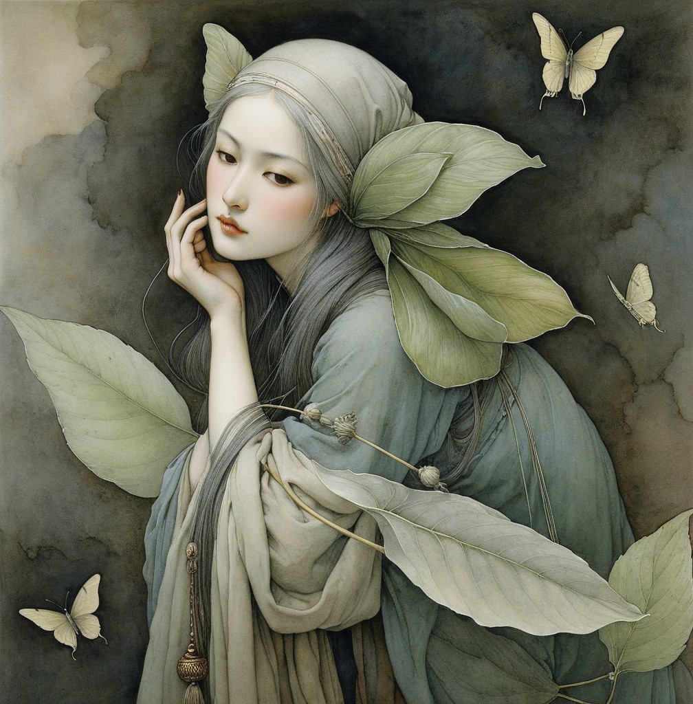 A serene woman in a flowing robe gazes thoughtfully, surrounded by delicate birds. Elegant fabrics and soft colors create a tranquil, dreamlike atmosphere, highlighting her grace and poise.