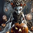 A mysterious figure with a striking mask and dark attire crouches in a mystical forest, cradling a glowing orb. Surrounded by eerie lanterns and a carved pumpkin, the atmosphere is enchanting yet haunting.