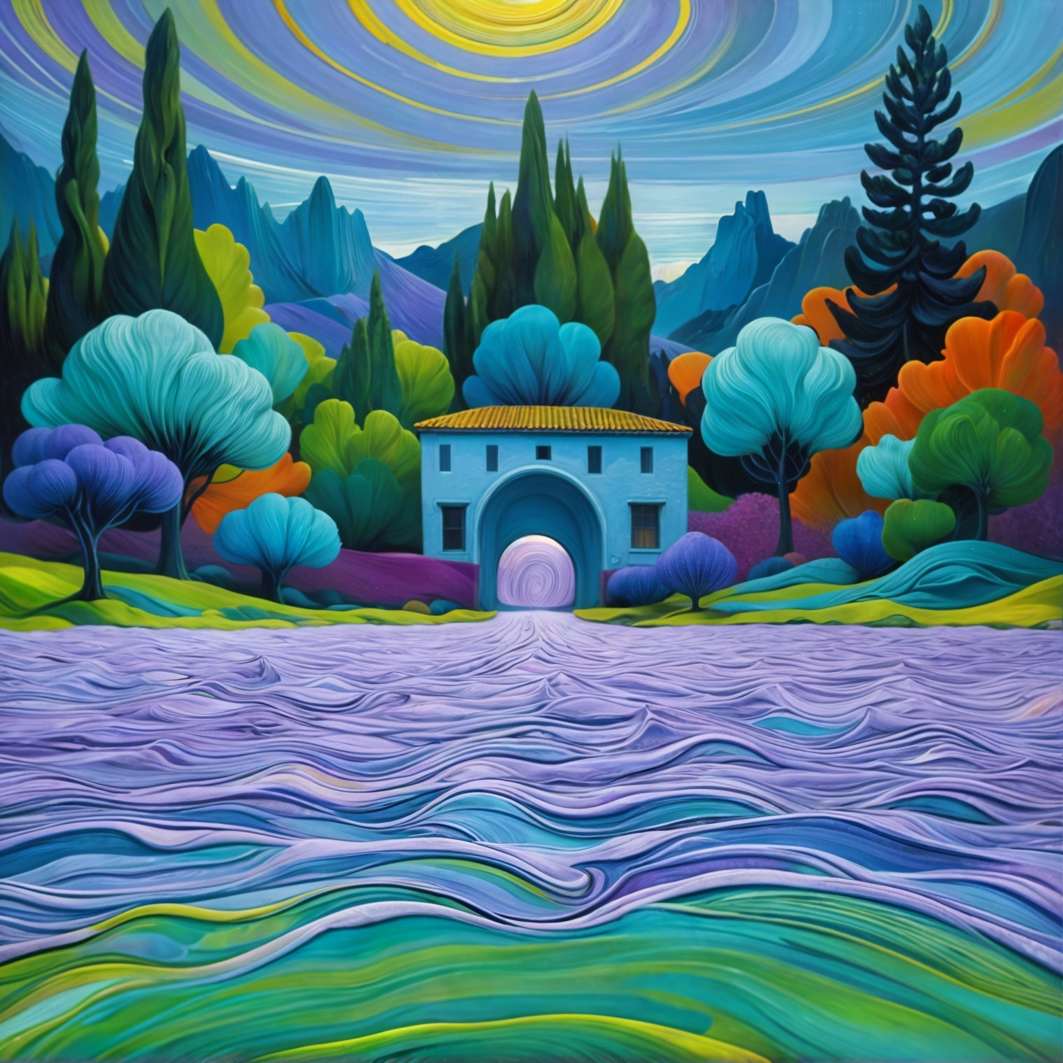 A vibrant landscape features rolling mountains under a swirling sunlit sky. Lush, colorful foliage surrounds a flowing purple river, creating a harmonious and dynamic natural scene.