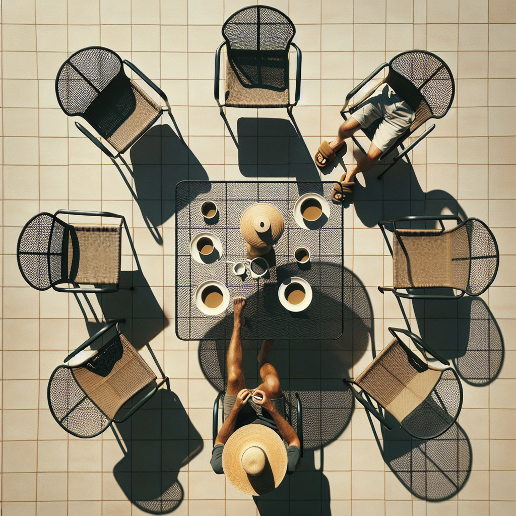 The artwork features stylized figures with exaggerated facial features and geometrical shapes, arranged around a central figure. The color palette includes blacks, whites, and muted tones, creating a striking composition.