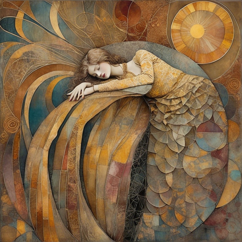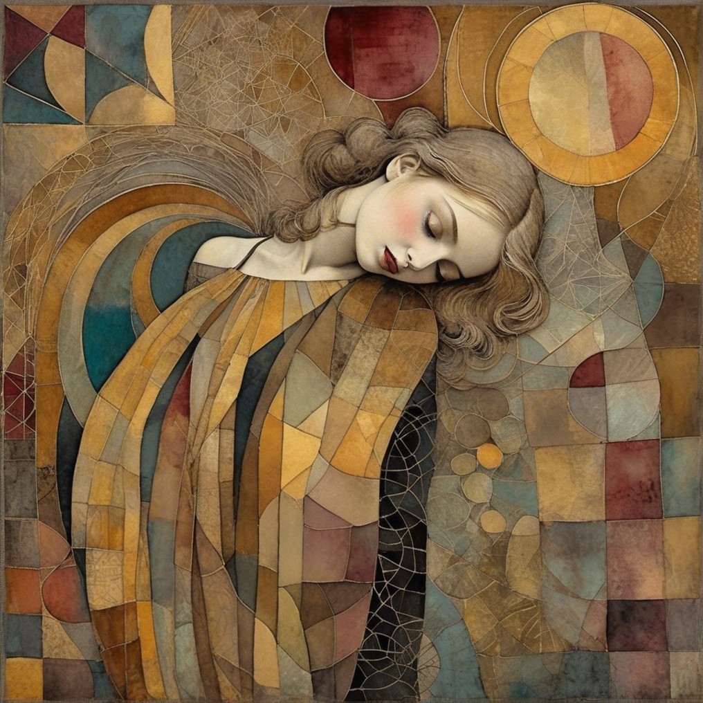 Patchwork fading tones of melancholy vintage summer nostalgia, soul search in portrait in ochre, patina of wine stains, mercury glass. Light and gossamer haze. art brut, moody, somber, desaturated colors, in the style of Paul Klee, Arthur Rackham, Banksy Stunning stylized, beautiful woman, intricate zentangle illustration, watercolor and ink painting, meticulous detail with fine pen strokes, intricate patterns, fractals, ochre and indigo colors, Amanda Clark, Catrin Welz-Stein, Zdzisław Beksiński, and Dee Nickerson