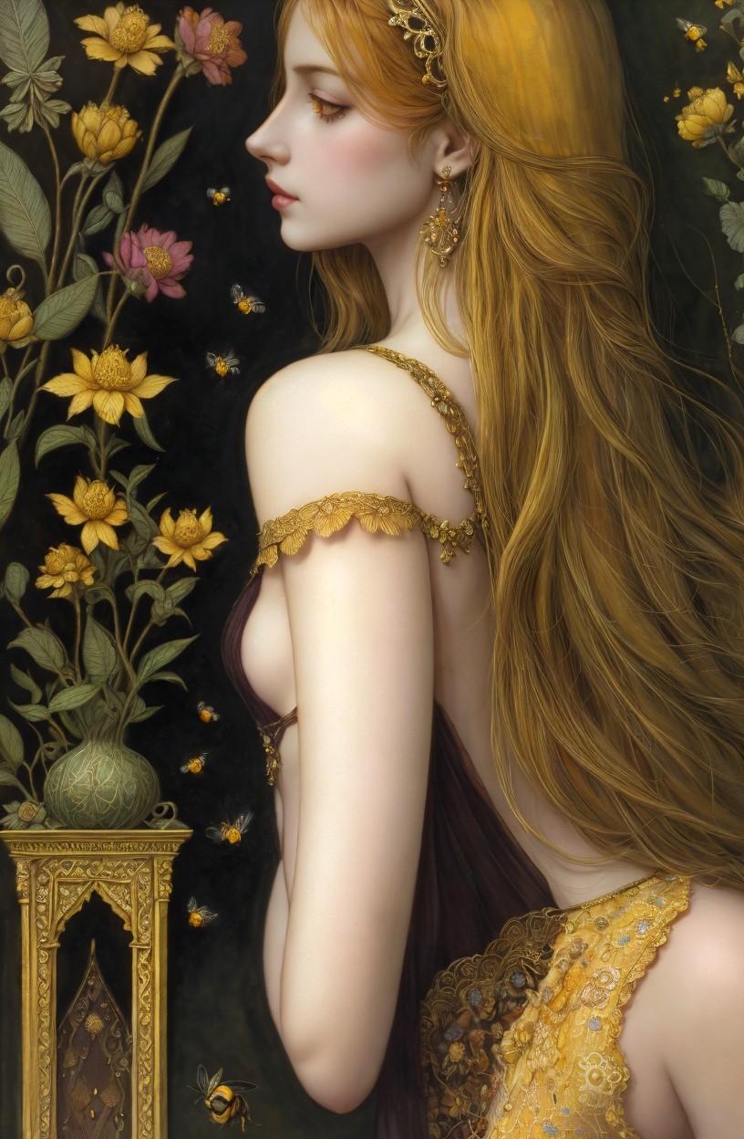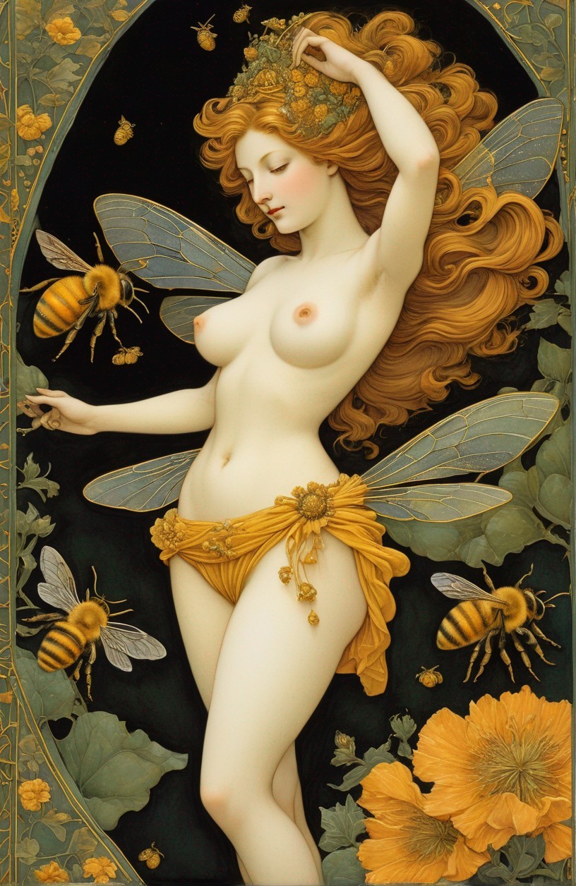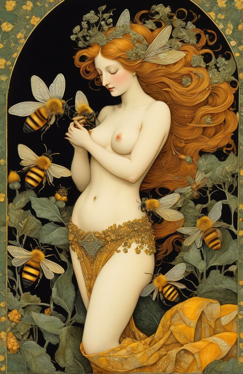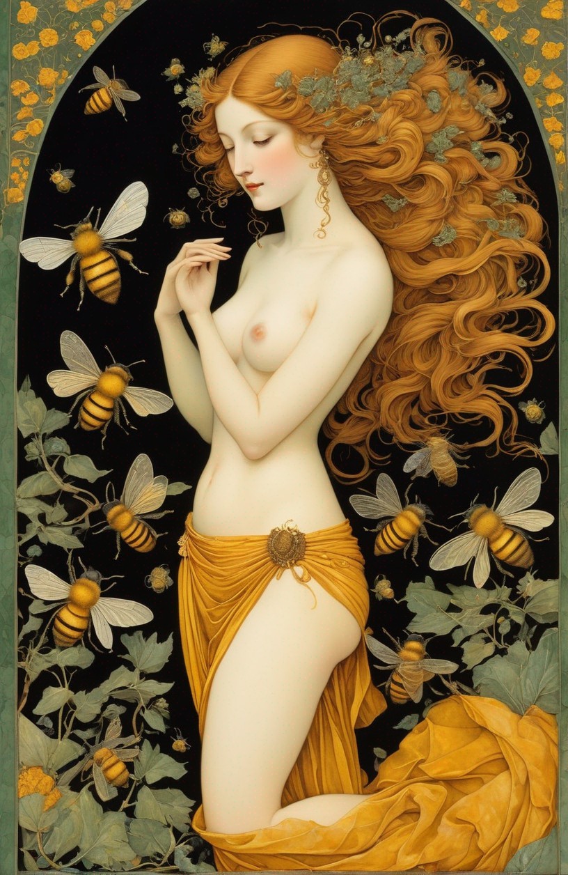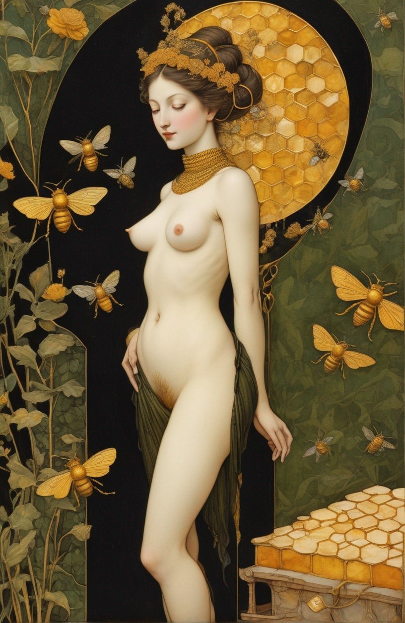 + Prompt:Melissae. Nymph of beehives, bees and honey. 3rd century Persian miniature art, golden ochre, sage green, dark yellow, paprika, Velvet Black, Shabby, Dull Gold, Amber Gray, Golden Ratio, Surreal Fantasy, Elegant, High Definition Ultra Fine 3D Line, Zenangle Style, Watercolor Patchwork , Arthur Rackham Style, Paul Kidby, , Jacek yerka, Extremely Detailed, Intricate, Thoughtful, HDR, Fractal, Beautiful, Award Winning, Fantasy Look, Fantasy, Crisp Quality