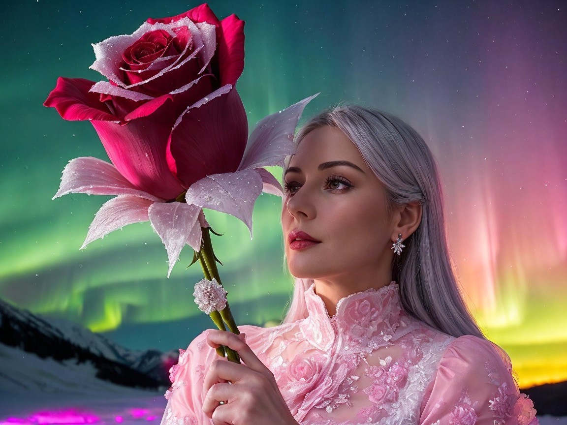A woman with long, light hair holds a large red rose, gazing thoughtfully into the distance. Vibrant auroras dance in the night sky behind her, adding a magical touch to the snowy landscape.